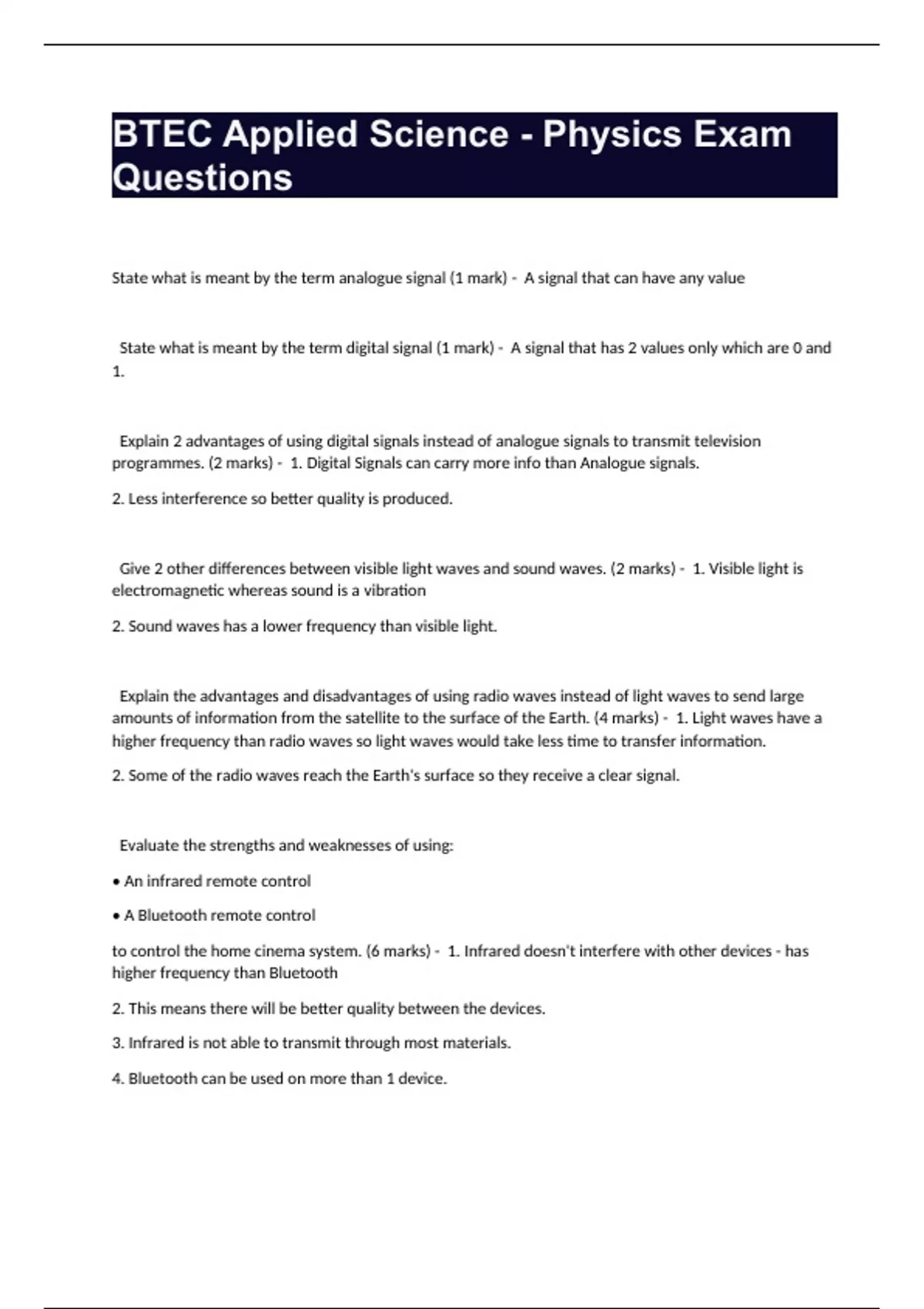 BTEC Applied Science - Physics Exam Questions State what is meant by the term analogue signal (1 mark) - A signal that can have any value State what is meant by the term digital signal (1 mark) - A signal that has 2 values only which are 0 and 1. Explain 2 advantages of using digital signals instead of analogue signals to transmit television programmes. (2 marks) - 1. Digital Signals can carry more info than Analogue signals. 2. Less interference so better quality is produced. Give 2 other differences between visible light waves and sound waves. (2 marks) - 1. Visible light is electromagnetic whereas sound is a vibration 2. Sound waves has a lower frequency than visible light. Explain the advantages and disadvantages of using radio waves instead of light waves to send large amounts of information from the satellite to the surface of the Earth. (4 marks) - 1. Light waves have a higher frequency than radio waves so light waves would take less time to transfer information. 2. Some of the radio waves reach the Earth's surface so they receive a clear signal. Evaluate the strengths and weaknesses of using: • An infrared remote control • A Bluetooth remote control to control the home cinema system. (6 marks) - 1. Infrared doesn't interfere with other devices - has higher frequency than Bluetooth 2. This means there will be better quality between the devices. 3. Infrared is not able to transmit through most materials. 4. Bluetooth can be used on more than 1 device. 5. Can work through walls. 6. It can interfere with other Bluetooth devices if close by. Describe how a longitudinal wave is produced on a slinky spring. (2 marks) - The slinky is pushed and pulled paralell to the direction of wave Explain why a mobile phone might not receive a signal when in range of a neurotransmitter. (2 marks) - Being below ground level can cause attenuation.
