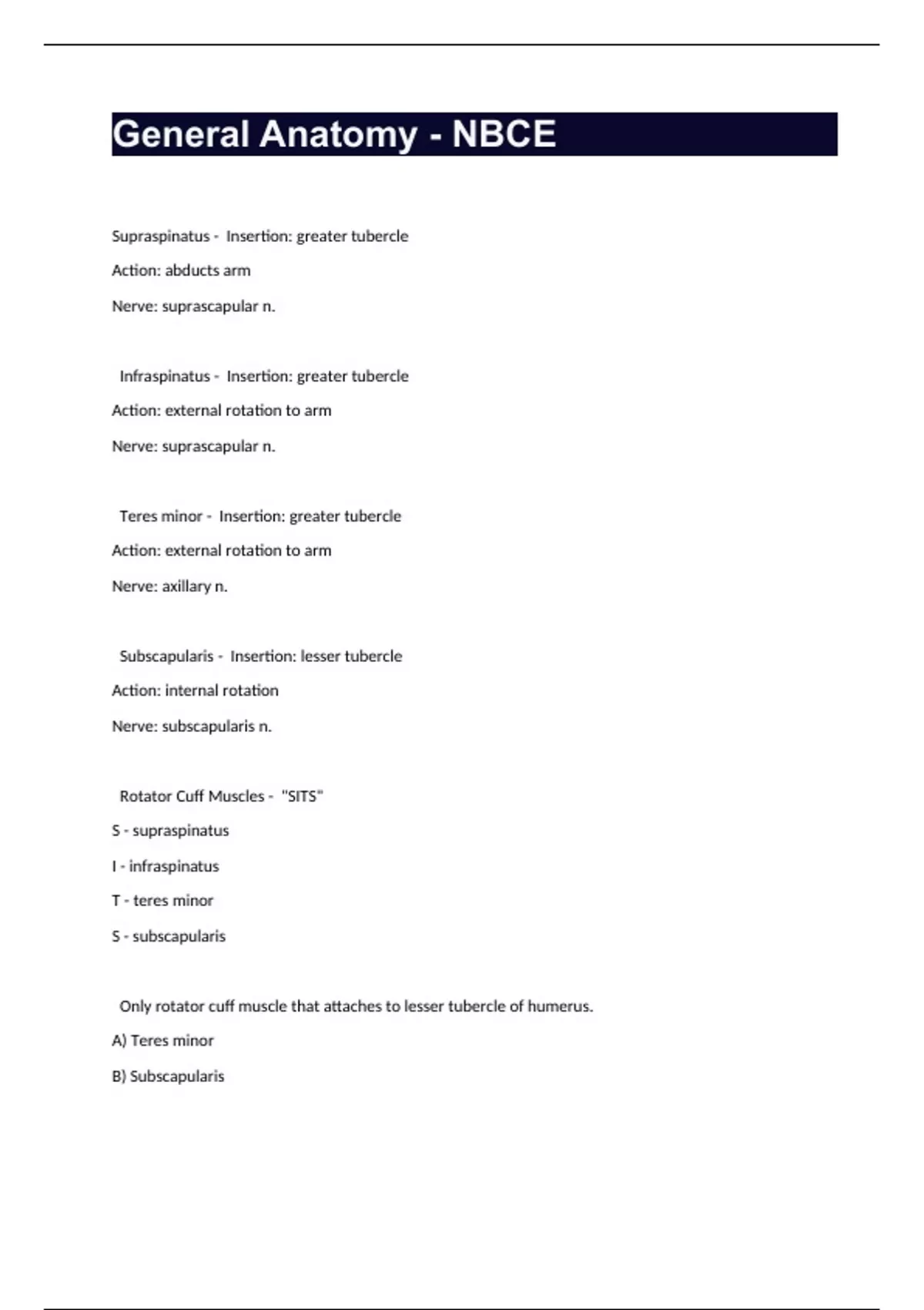General Anatomy - NBCE Supraspinatus - Insertion: greater tubercle Action: abducts arm Nerve: suprascapular n. Infraspinatus - Insertion: greater tubercle Action: external rotation to arm Nerve: suprascapular n. Teres minor - Insertion: greater tubercle Action: external rotation to arm Nerve: axillary n. Subscapularis - Insertion: lesser tubercle Action: internal rotation Nerve: subscapularis n. Rotator Cuff Muscles - "SITS" S - supraspinatus I - infraspinatus T - teres minor S - subscapularis Only rotator cuff muscle that attaches to lesser tubercle of humerus. A) Teres minor B) Subscapularis C) Teres major D) Supraspinatus - B Only rotator cuff muscle that has axillary nerve as nerve supply. A) Infraspinatus B) Teres major C) Subscapularis D) Teres minor - D Longest muscle in the body is: A) Peroneus longus B) Semimembranosus C) Sartorius D) Stapedius - C Shortest muscle in the body is: A) Stapedius B) Sartorius C) Semimebranosus D) Peroneus brevis - A Which of the following does not make up the hamstrings? A) Biceps femoris B) Semimembranosus C) Rectus femoris D) Semitendinosus - C Which of the following does not have musculocutaneous as its nerve supply? A) Pronator teres B) Biceps brachii C) Coracobrachialis D) Brachialis - A Which of the following has subscapular nerve as its nerve supply? A) Brachialis B) Teres major C) Teres minor D) Pronator teres - B Which of the following rotator cuff muscles abducts the arm? A) Teres minor B) Infraspinatus C) Subscapularis D) Supraspinatus - D Which of the following rotator cuff muscles internally rotates the arm? A) Teres minor B) Subscapularis C) Infraspinatus D) Supraspinatus - B Which of the following muscles retracts the scapula? A) Trapezius B) Rhomboids C) Serratus anterior D) Teres major - B Which of the following muscles receives its nerve supply from dorsal scapular nerve? A) Rhomboids B) Latissimus dorsi C) Teres major D) Brachialis - A Which of the following muscles receives its blood supply from scapular circumflex? A) Teres minor B) Teres major C) Pectoralis minor D) Pactoralis major - A Which of the following receives its nerve supply from long thoracic nerve? A) Latissimus dorsi B) Rhomboids C) Teres major D) Serratus anterior - D Which of the following receives its nerve supply from thoracodorsal nerve? A) Serratus anterior B) Trapezius C) Latissimus dorsi D) Pactoralis minor - C Short head of biceps brachii attaches to: A) Supraglenoid tubercle of scapula B) Coracoid process C) Coronoid process D) Humerus - B Long head of biceps brachii attaches to: A) Humerus B) Coronoid process C) Supraglenoid tubercle of scapula D) Coracoid process - C Which of the following muscles receives the median nerve for its nerve supply? A) Brachialis B) Biceps brachii (short head) C) Biceps brachii (long head) D) Pronator teres - D All of the following muscles have their origins on the ischial tuberosity except: A) Short head of biceps femoris B) Semitendinosus C) Long head of biceps femoris D) Semimembranosus - A The short head of the biceps femoris has its insertion on the _____________________. A) Linea aspira of femur B) Tibia C) Fibula D) Ischial tuberosity - C The median nerve is the nerve supply for which of the following? A) Biceps brachii B) Pronator teres C) Brachioradialis D) Coracobrachialis - B All of the following have musculocutaneous nerve as their nerve supply except: A) Pronator teres B) Biceps brachii C) Brachialis D) Coracobrachialis - A All of the following have brachial artery as their blood supply except: A) Pronator teres B) Biceps brachii C) Brachialis D) Coracobrachialis - A Which of the following has ulnar artery as its blood supply? A) Brachioradialis B) Brachialis C) Pronator teres D) Coracobrachialis - C Which of the following is the most commonly ligament injured in the ankle? A) Tibiotalar B) Anterior talofibular C) Posterior talofibular D) Tibiocalcaneus - B Which of the following is not part of the deltoid ligament? A) Tibiotalar B) Tibionavicular C) Tibiocalcaneus D) Plantar calcaneonavicular - D Which of the following is part of the spring ligament? A) Tibiocalcaneus B) Calcaneofibular C) Plantar Calcaneonavicular D) Tibiotalar - C Which of the following is the strongest ligament in the foot? A) Posterior tibiotalar B) Anterior tibiotalar C) Tibiocalcaneus D) Tibionavicular - A The sustentaculum tali connects calcaneus to what other bone in the foot? A) Cuboid B) Talus C) Navicular D) Fifth metatarsal - C Which ligament of the foot maintains the longitudinal arch of the foot? A) Tibiocalcaneus B) Tibionavicular C) Calcaneofibular D) Plantar calcaneonavicular - D What ligament of the hip connects the ischium to the greater trochanter? A) Ischiofemoral B) Acetabular labrum