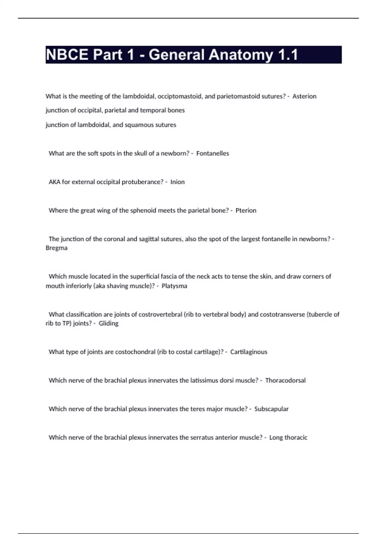 NBCE Part 1 - General Anatomy 1.1 What is the meeting of the lambdoidal, occiptomastoid, and parietomastoid sutures? - Asterion junction of occipital, parietal and temporal bones junction of lambdoidal, and squamous sutures What are the soft spots in the skull of a newborn? - Fontanelles AKA for external occipital protuberance? - Inion Where the great wing of the sphenoid meets the parietal bone? - Pterion The junction of the coronal and sagittal sutures, also the spot of the largest fontanelle in newborns? - Bregma Which muscle located in the superficial fascia of the neck acts to tense the skin, and draw corners of mouth inferiorly (aka shaving muscle)? - Platysma What classification are joints of costrovertebral (rib to vertebral body) and costotransverse (tubercle of rib to TP) joints? - Gliding What type of joints are costochondral (rib to costal cartilage)? - Cartilaginous Which nerve of the brachial plexus innervates the latissimus dorsi muscle? - Thoracodorsal Which nerve of the brachial plexus innervates the teres major muscle? - Subscapular Which nerve of the brachial plexus innervates the serratus anterior muscle? - Long thoracic The anterior axillary fold is formed by the prominence of the? - Pectoralis major The posterior axillary fold is formed by the prominence of the? - Latissimus dorsi What landmark runs from the pubic symphysis to the xiphoid process in the midline; formed by the fusion of the rectus abdominus muscles? - Linea alba What is found at the level of the L3 disc but in the T10 dermatome? - Umbillicus What dermatome typically includes the navel? - T10 What dermatome typically includes the nipples? - T4 Which joint functions to attach the appendicular skeleton to the axial skeleton? - Sternoclavicular Vessels that run parallel to the long axis of bone are contained within? - Haversion canals Canals which run perpendicular to the long axis of bone, which allow blood vessels to enter the bone from the periosteum are called? - Volkman canals Ends of long bones? - Epiphysis Tubular shaft of long bones, containing marrow? - Diaphysis The part of the diaphysis nearest to the epiphysis, richest blood supply and most susceptible to infection? - Metaphysis Covering over bone, responsible for circumferential growth; has the most pain receptors? - Periosteum If classifying joints based on function, which type are the MOST moveable? - Diarthroses If classifying joints based on function, which type are the LEAST moveable (i.e. immoveable)? - Synarthroses What type of fibrous joint are the articulations of the roots of the teeth? - Gomphosis What type of cartilaginous joints are intervertebral discs? - Symphysis What type of cartilaginous joints are usually temporarily found between the epiphysis and diaphysis of a growing bone; when growth ceases the hyaline cartilage is replaced by bone? - Synchondrosis Synovial fluid contains muccopolysaccharide and what substance? - Hyaluronic acid What type of synovial joints allow flexion and extension only occuring in the elbow, knee, ankle and interphalangeal joints; the AKA for hinge? - Ginglymus What type of synovial joint allows rotation around a longitudinal axis (i.e. atlas/axis); the AKA for pivot? - Trochoid What type of synovial joint allows sliding movement between 2 flat surfaces in the facet joints, carpals, tarsals, sternoclavicular, etc? - Gliding plane What type of synovial joint is involved in the shoulder and the hip? - Ball and socket Approximately what vertebral level would we find the spine of the scapula? - T3 Which structure on the distal humerus articulates with the head of the radius? - Capitulum What structure on the distal humerus articulates with the trochlear notch of the ulna? - Trochlear What structure on the posterior aspect of the distal humerus receives the olecranon process of the ulna when the elbow is in extension? - Olecranon fossa What ligament converts the Intertubecular groove into a tunnel for the long head of the biceps muscle? - Transverse humeral What is the Latin term for "bowlegged"? - Varus What is the Latin term for "knock kneed"? - Valgus The articular disc of the distal radioulnar joint binds the radius and the ulna firmly together, articulating with the medial part of the lunate in anatomical neutral; when the hand is adducted, it articulates with? - Triquetral bone What are the named bony growths in the carpometacarpal joints, occurring in rheumatoid arthritis? - Haygarth's nodes What are the named bony growths in the PIP joints, occurring in rheumatoid arthritis and osteoarthritis? - Bouchard's nodes What are the named bony growths in the DIP joints, occurring in rheumatoid arthritis? - Heberden's nodes What carpal bone is the most often fractured? - Scaphoid What carpal bone is the most often dislocated? - Lunate The carpal bone primarily palpated underneath the anatomical snuff box is? - Scaphoid Depression between hook of hamate and pisiform containing the ulnar nerve and artery is converted to a tunnel by the? - Pisohamate ligament Which ligament connects from the ASIS to the intertrochanteric line of the femur and prevents over extension of the hip joint? - Iliofemoral Which ligament resists hyperextension of the hip joint? - Pubofemoral Which ligament connects from the ischial wall of the acetabulum to the neck of the femur and prevents over extension of the hip joint? - Ischiofemoral Tenderness in the tibial tuberosity can arise from? - Osgood-Schlatter's syndrome Which ligament of the knee resists hyperextension? - ACL Which ligament of the knee resists hyperflexion, thus keeping the femur from anteriorly displacing on the tibia? - PCL Which ligament of the knee is stressed with varus? - Lateral (fibular) collateral Which ligament of the knee is stressed with valgus? - Medial (tibial) collateral The proximal or superior tibiofibular joint is not considered part of the knee joint; what type joint is it? - Gliding plane The distal or inferior tibiofibular joint is not consider