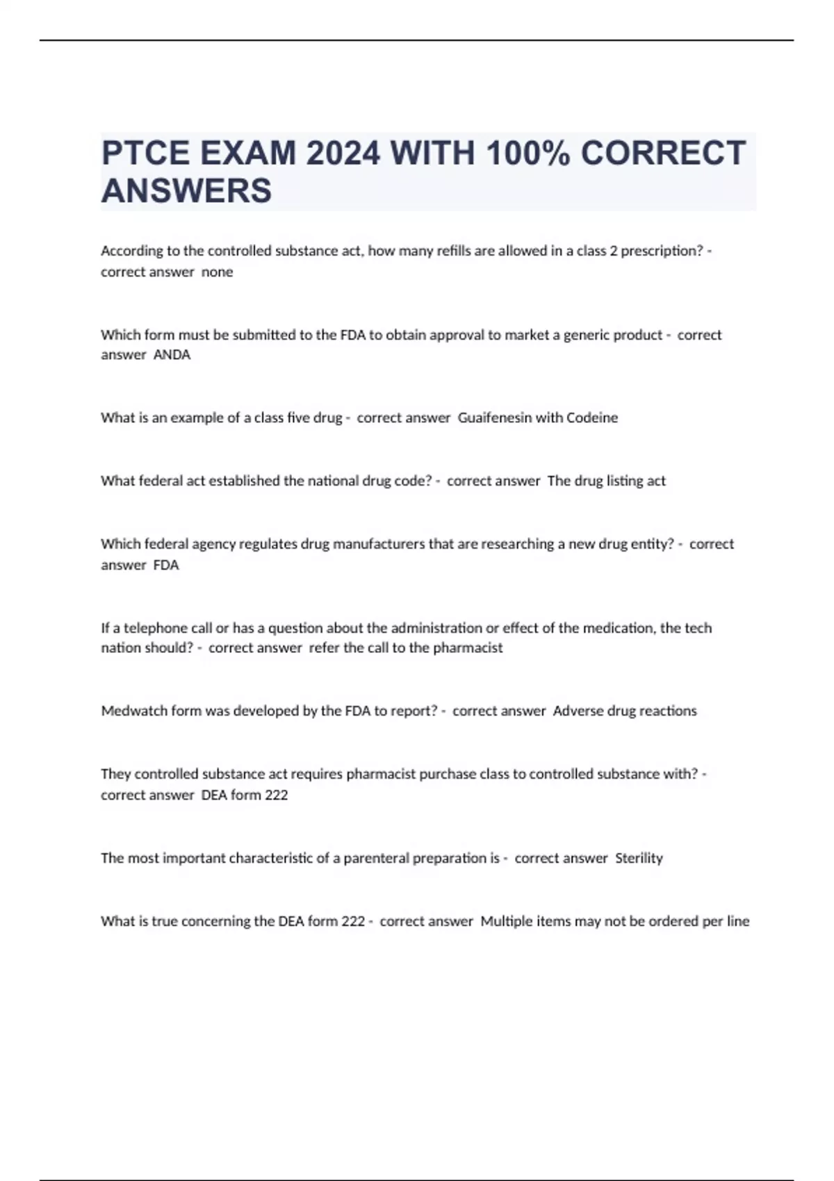 According to the controlled substance act, how many refills are allowed in a class 2 prescription? - correct answer none Which form must be submitted to the FDA to obtain approval to market a generic product - correct answer ANDA What is an example of a class five drug - correct answer Guaifenesin with Codeine What federal act established the national drug code? - correct answer The drug listing act Which federal agency regulates drug manufacturers that are researching a new drug entity? - correct answer FDA If a telephone call or has a question about the administration or effect of the medication, the tech nation should? - correct answer refer the call to the pharmacist Medwatch form was developed by the FDA to report? - correct answer Adverse drug reactions They controlled substance act requires pharmacist purchase class to controlled substance with? - correct answer DEA form 222 The most important characteristic of a parenteral preparation is - correct answer Sterility What is true concerning the DEA form 222 - correct answer Multiple items may not be ordered per line If the re