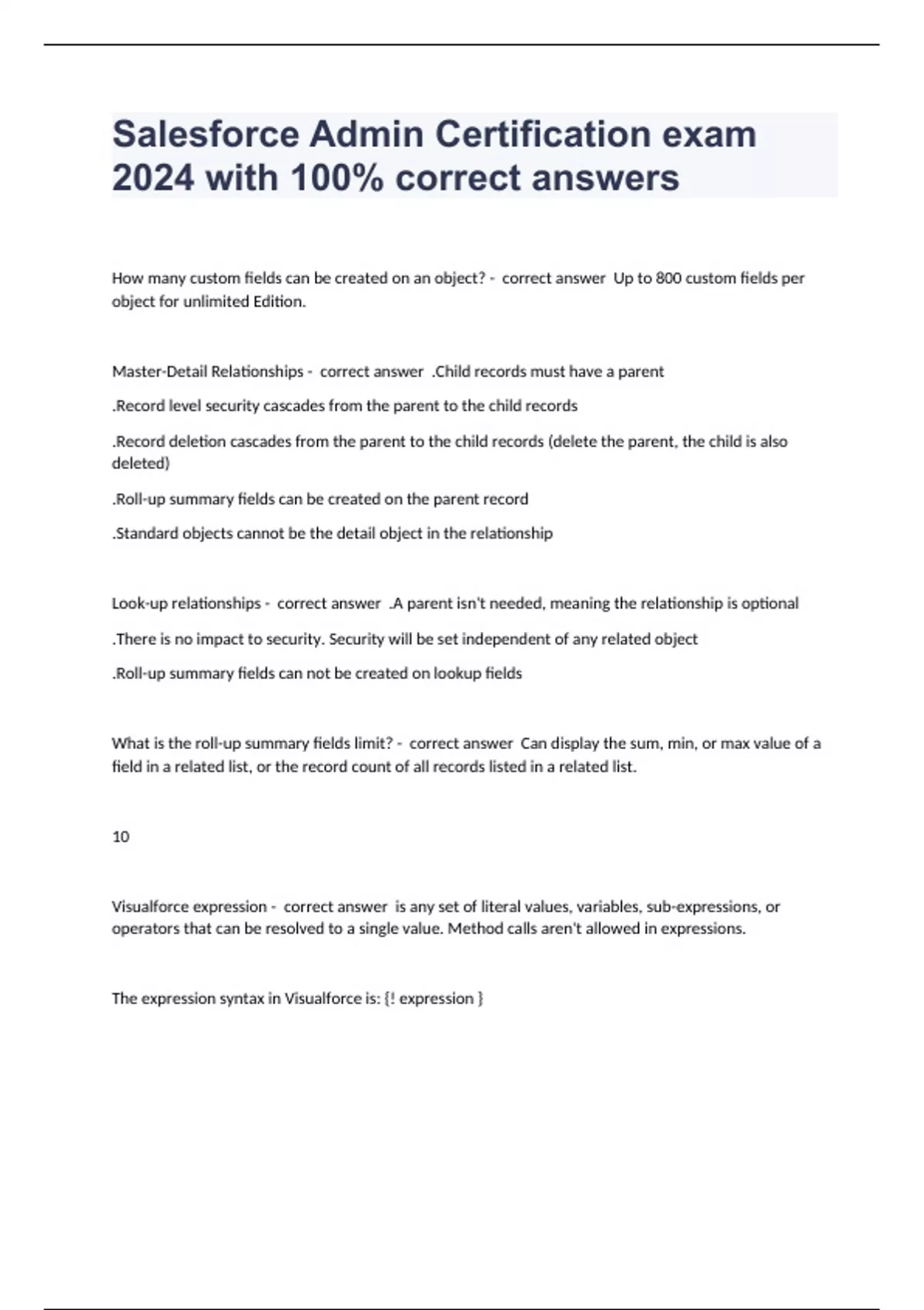 How many custom fields can be created on an object? - correct answer Up to 800 custom fields per object for unlimited Edition. Master-Detail Relationships - correct answer .Child records must have a parent .Record level security cascades from the parent to the child records .Record deletion cascades from the parent to the child records (delete the parent, the child is also deleted) .Roll-up summary fields can be created on the parent record .Standard objects cannot be the detail object in the relationship Look-up relationships - correct answer .A parent isn't needed, meaning the relationship is optional .There is no impact to security. Security will be set independent of any related object .Roll-up summary fields can not be created on lookup fields What is the roll-up summary fields limit? - correct answer Can display the sum, min, or max value of a field in a related list, or the record count of all records listed in a related list. 10 Visualforce expression - correct answer is any set of literal values, variables, sub-expressions, or operators that can be resolved to a single value. Method calls aren't allowed in expressions. The expression syntax in Visualforce is: {! expression } Coarse-grained components - correct answer Coarse-grained components provide a significant amount of functionality in a single component, and might add a lot of information and user interface to the page it's used on. These components adds many fields, sections, buttons, and other user interface elements to the page in just one line of markup Fine-grained components - correct answer Fine-grained components provide more focused functionality, and enable you to design the page to look and behave the way you want. output