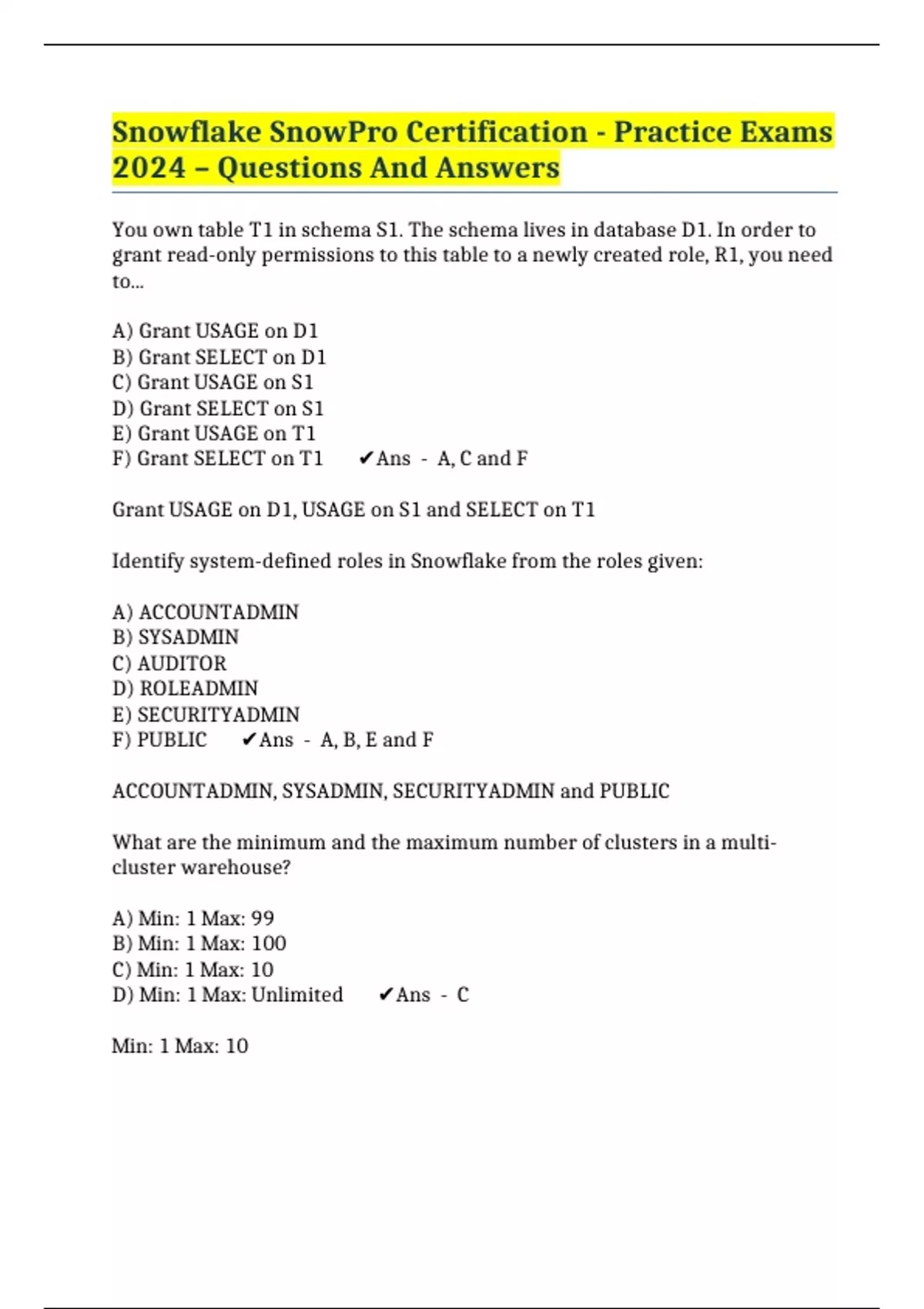 Snowflake SnowPro Certification - Practice Exams 2024 – Questions And Answers