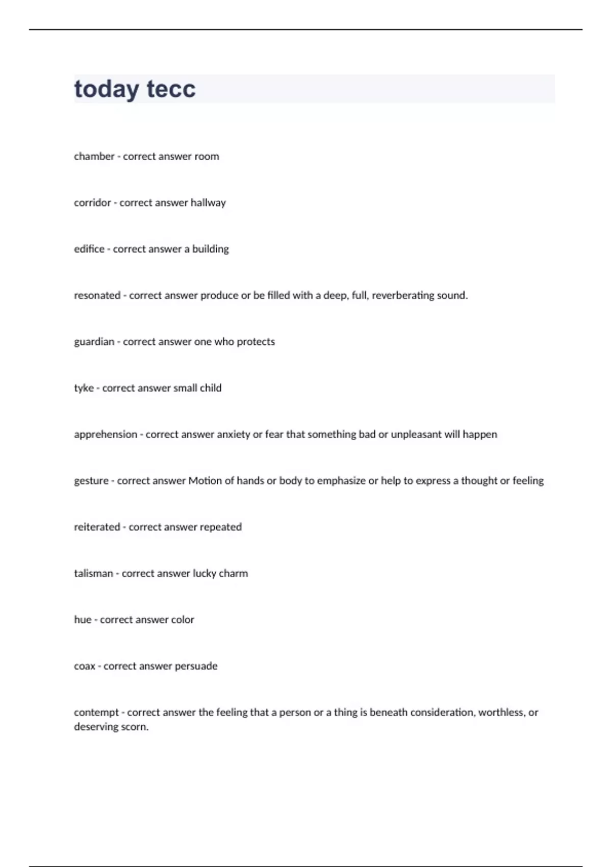 today chamber - correct answer room corridor - correct answer hallway edifice - correct answer a building resonated - correct answer produce or be filled with a deep, full, reverberating sound. guardian - correct answer one who protects tyke - correct answer small child apprehension - correct answer anxiety or fear that something bad or unpleasant will happen gesture - correct answer Motion of hands or body to emphasize or help to express a thought or feeling reiterated - correct answer repeated talisman - correct answer lucky charm hue - correct answer color coax - correct answer persuade contempt - correct answer the feeling that a person or a thing is beneath consideration, worthless, or deserving scorn. audible - correct answer able to be heard filched - correct answer snitched; stole deft - correct answer skillful disconcerted - correct answer confused impetuous - correct answer impulsive
