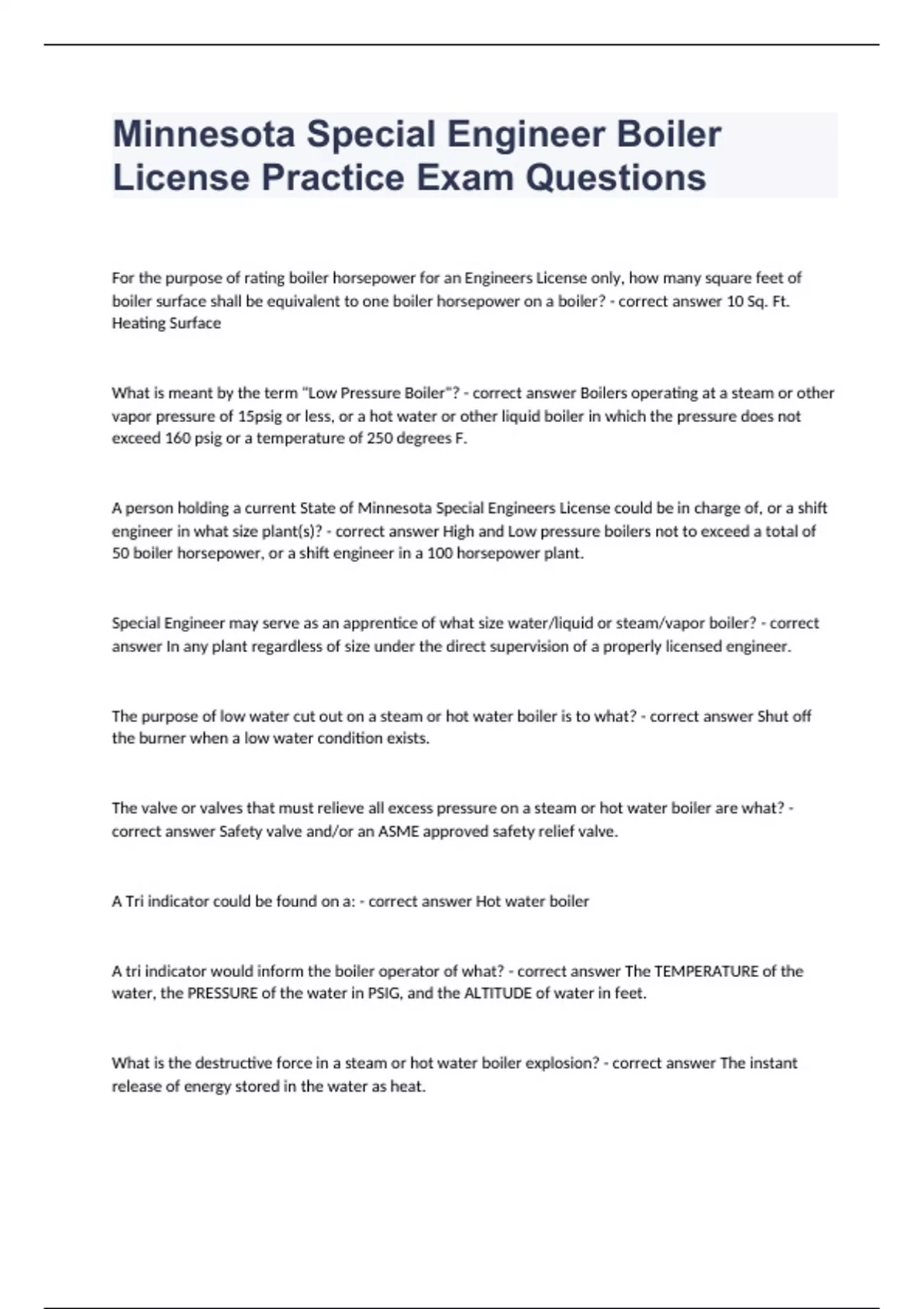 Minnesota Special Engineer Boiler License Practice Exam Questions fully solved 2023/2024