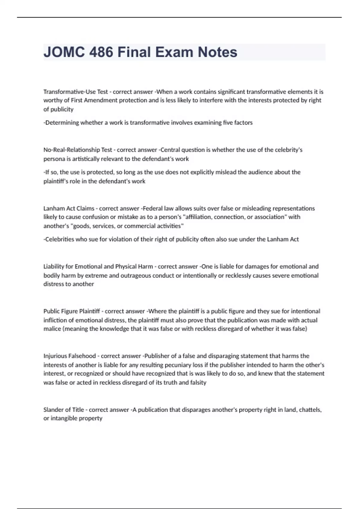 JOMC 486 Final Exam Notes Question and answers rated A+ 2023/2024 Transformative-Use Test - correct answer -When a work contains significant transformative elements it is worthy of First Amendment protection and is less likely to interfere with the interests protected by right of publicity -Determining whether a work is transformative involves examining five factors No-Real-Relationship Test - correct answer -Central question is whether the use of the celebrity's persona is artistically relevant to the defendant's work