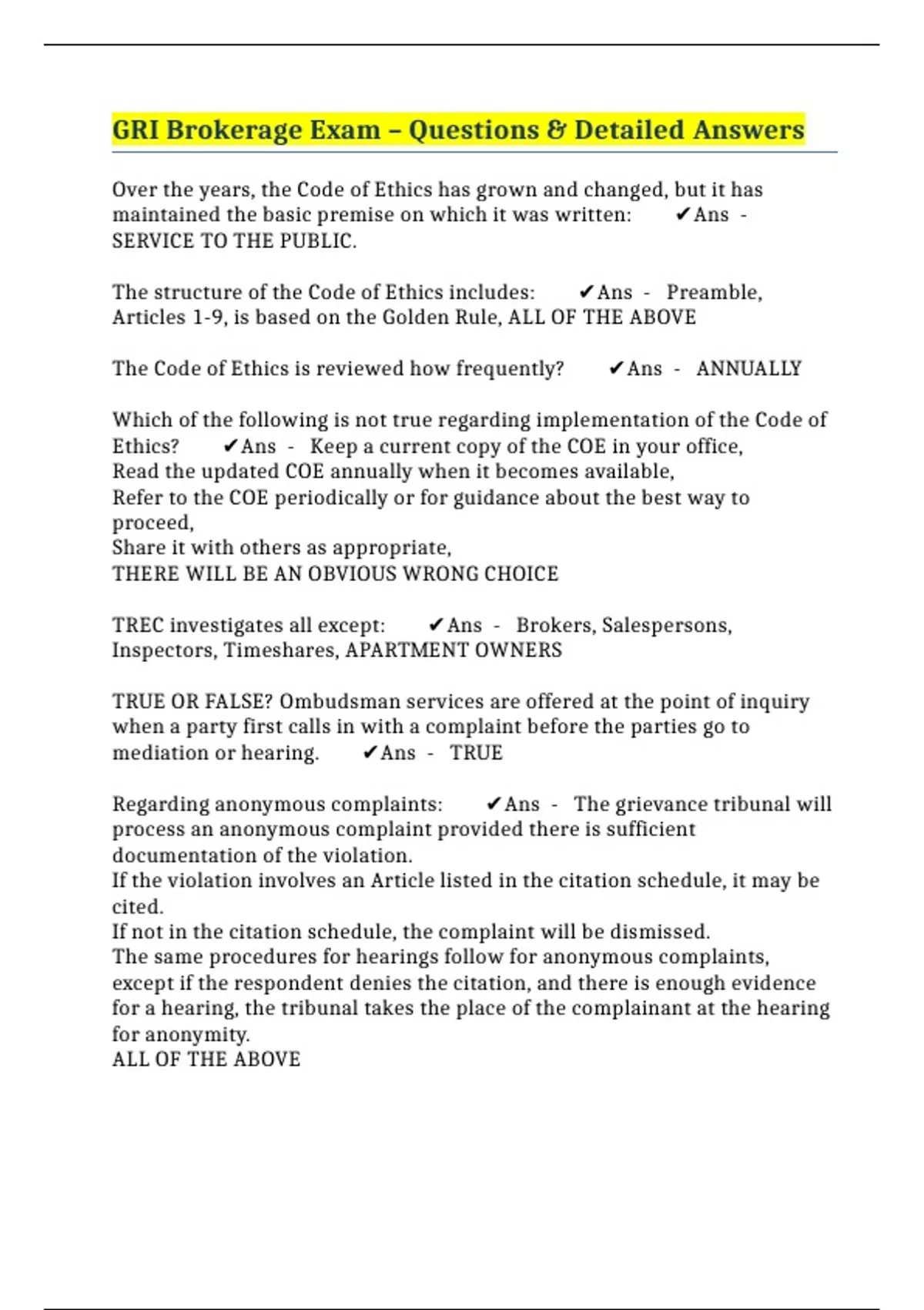 GRI Brokerage Exam – Questions & Detailed Answers