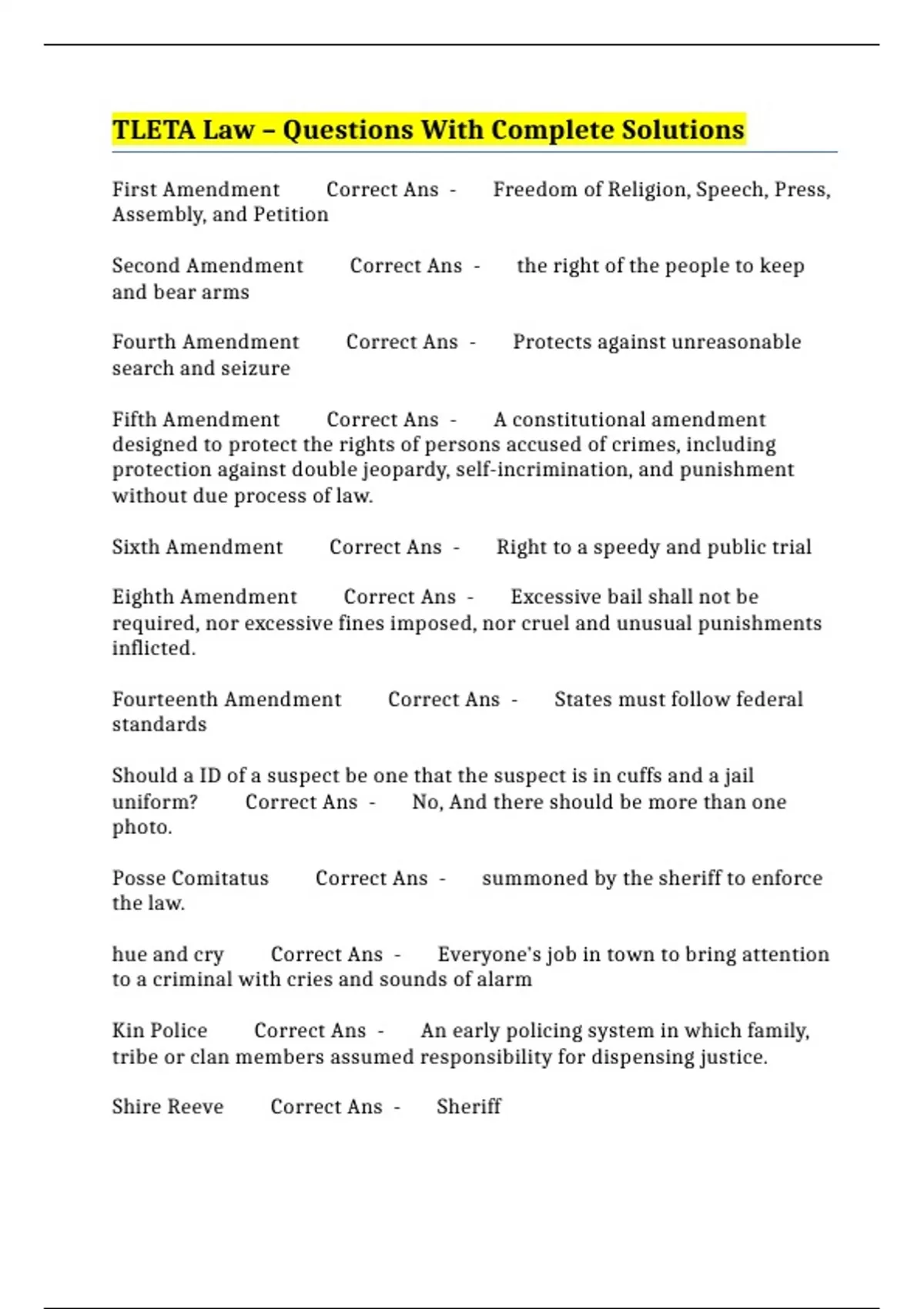 Eighth Amendment Correct Ans - Excessive bail shall not be