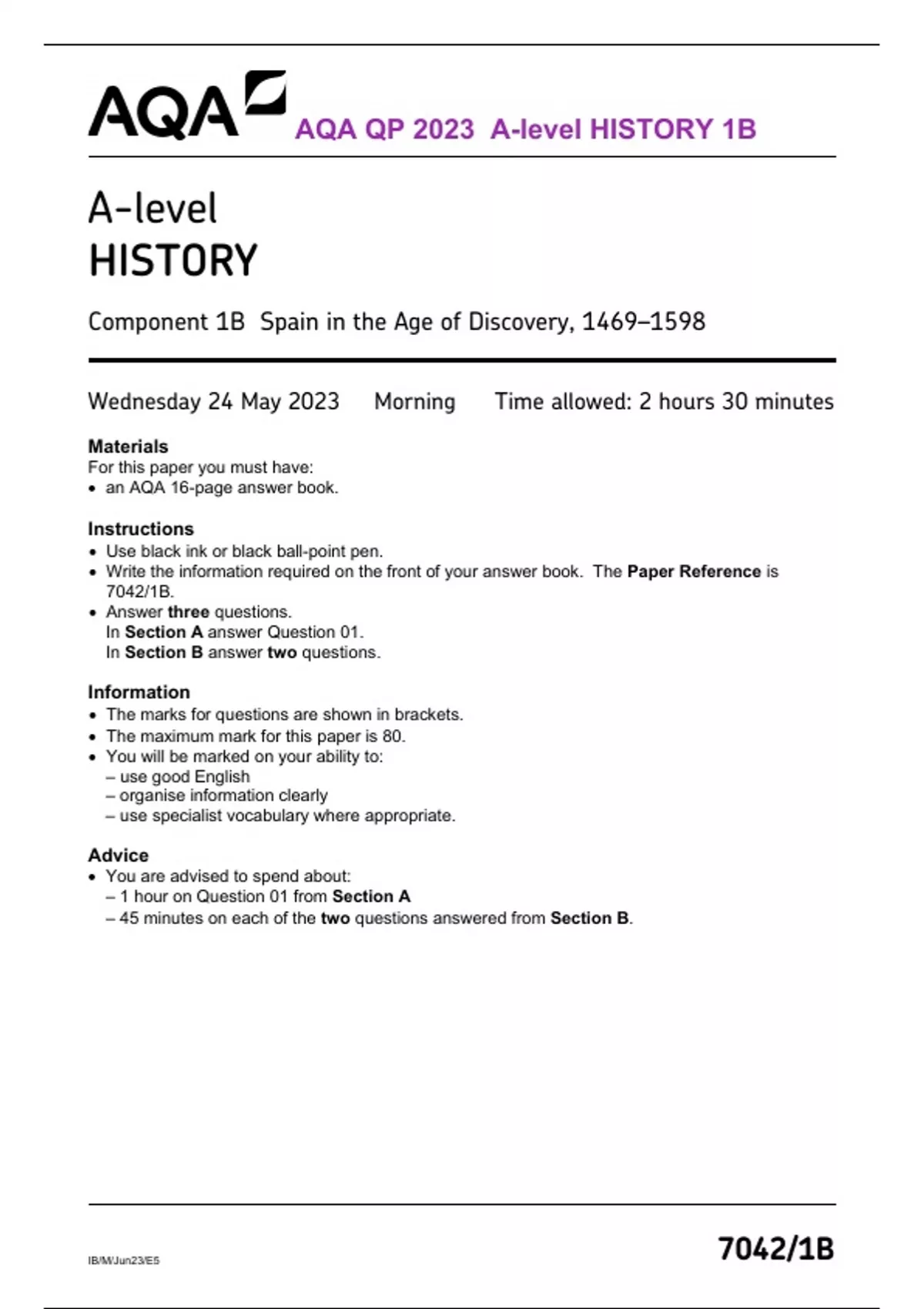 AQA QP 2023 A-level HISTORY 1B