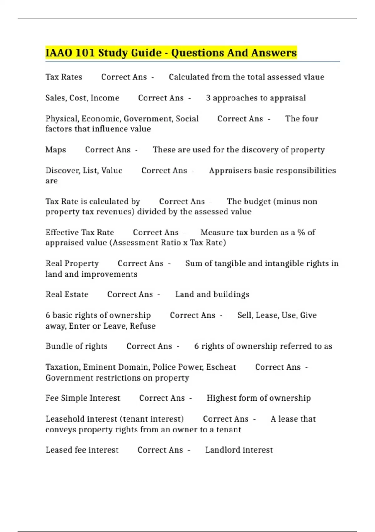 Real Property Correct Ans - Sum of tangible and intangible rights in