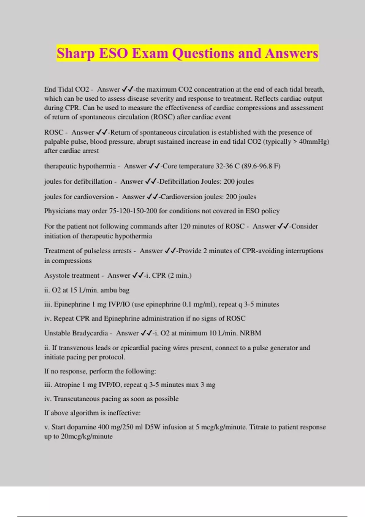 Sharp ESO Exam Questions and Answers End Tidal CO2 - Answer ️️ -the maximum CO2 concentration at the end of each tidal breath, which can be used to assess disease severity and response to treatment. Reflects cardiac output during CPR. Can be used to measure the effectiveness of cardiac compressions and assessment of return of spontaneous circulation (ROSC) after cardiac event ROSC - Answer ️️ -Return of spontaneous circulation is established with the presence of palpable pulse, blood pressure, abrupt sustained increase in end tidal CO2 (typically 40mmHg) after cardiac arrest therapeutic hypothermia - Answer ️️ -Core temperature 32-36 C (89.6-96.8 F) joules for defibrillation - Answer ️️ -Defibrillation Joules: 200 joules joules for cardioversion - Answer ️️ -Cardioversion joules: 200 joules Physicians may order for conditions not covered in ESO policy For the patient not following commands after 120 minutes of ROSC - Answer ️️ -Consider initiation of therapeutic hypothermia Treatment of pulseless arrests - Answer ️️ -Provide 2 minutes of CPR-avoiding interruptions in compressions Asystole treatment - Answer ️️ -i. CPR (2 min.) ii. O2 at 15 L/min. ambu bag iii. Epinephrine 1 mg IVP/IO (use epinephrine 0.1 mg/ml), repeat q 3-5 minutes iv. Repeat CPR and Epinephrine administration if no signs of ROSC Unstable Bradycardia - Answer ️️ -i. O2 at minimum 10 L/min. NRBM ii. If transvenous leads or epicardial pacing wires present, connect to a pulse generator and initiate pacing per protocol. If no response, perform the following: iii. Atropine 1 mg IVP/IO, repeat q 3-5 minutes max 3 mg iv. Transcutaneous pacing as soon as possible If above algorithm is ineffective: v. Start dopamine 400 mg/250 ml D5W infusion at 5 mcg/kg/minute. Titrate to patient response up to 20mcg/kg/minute