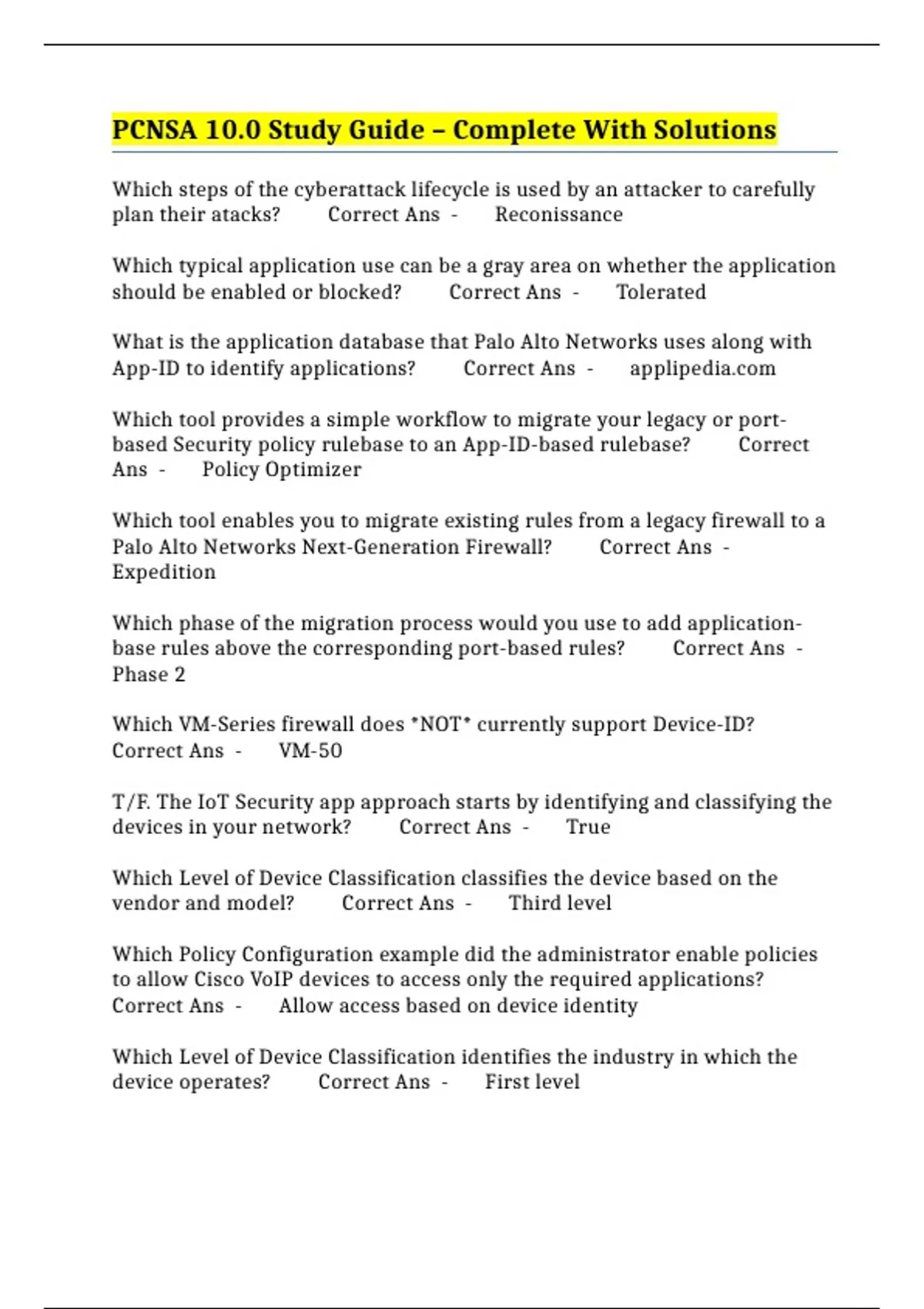 PCNSA 10.0 Study Guide – Complete With Solutions