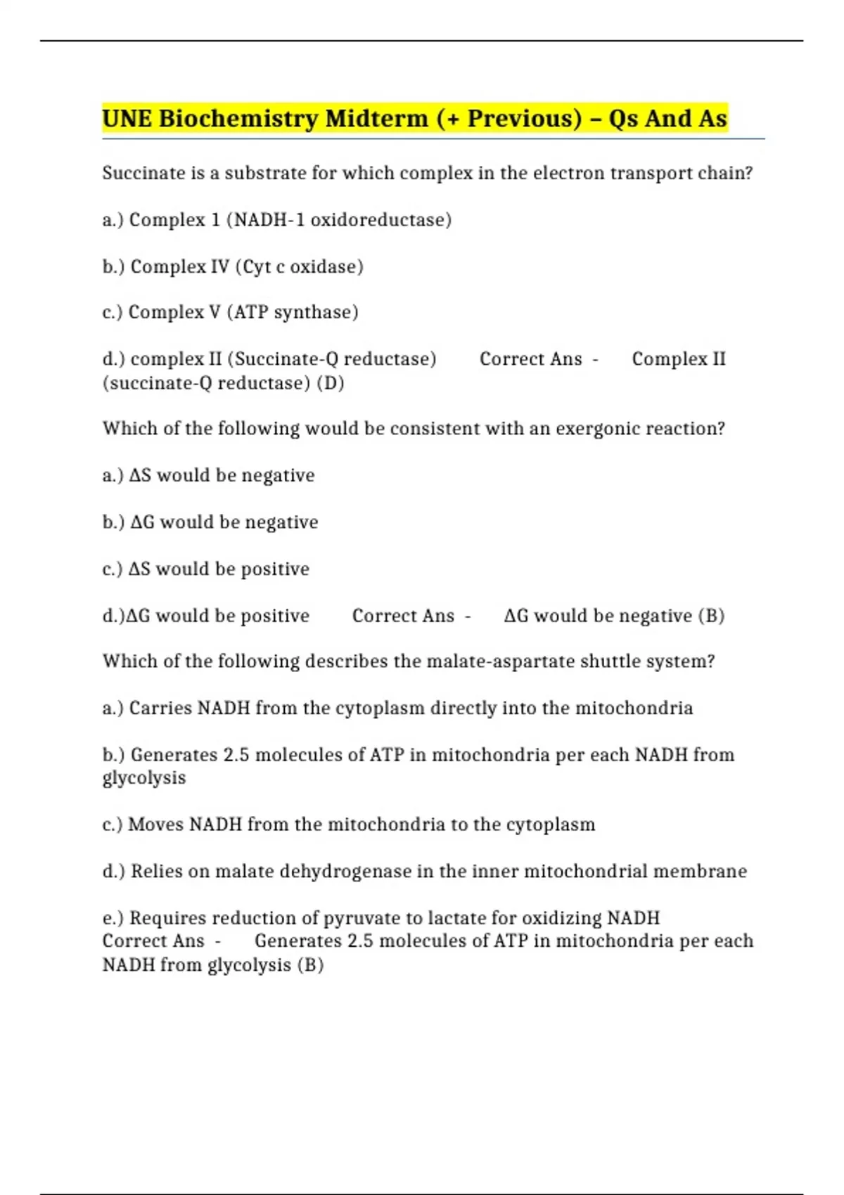 UNE Biochemistry Midterm (+ Previous) – Qs And As