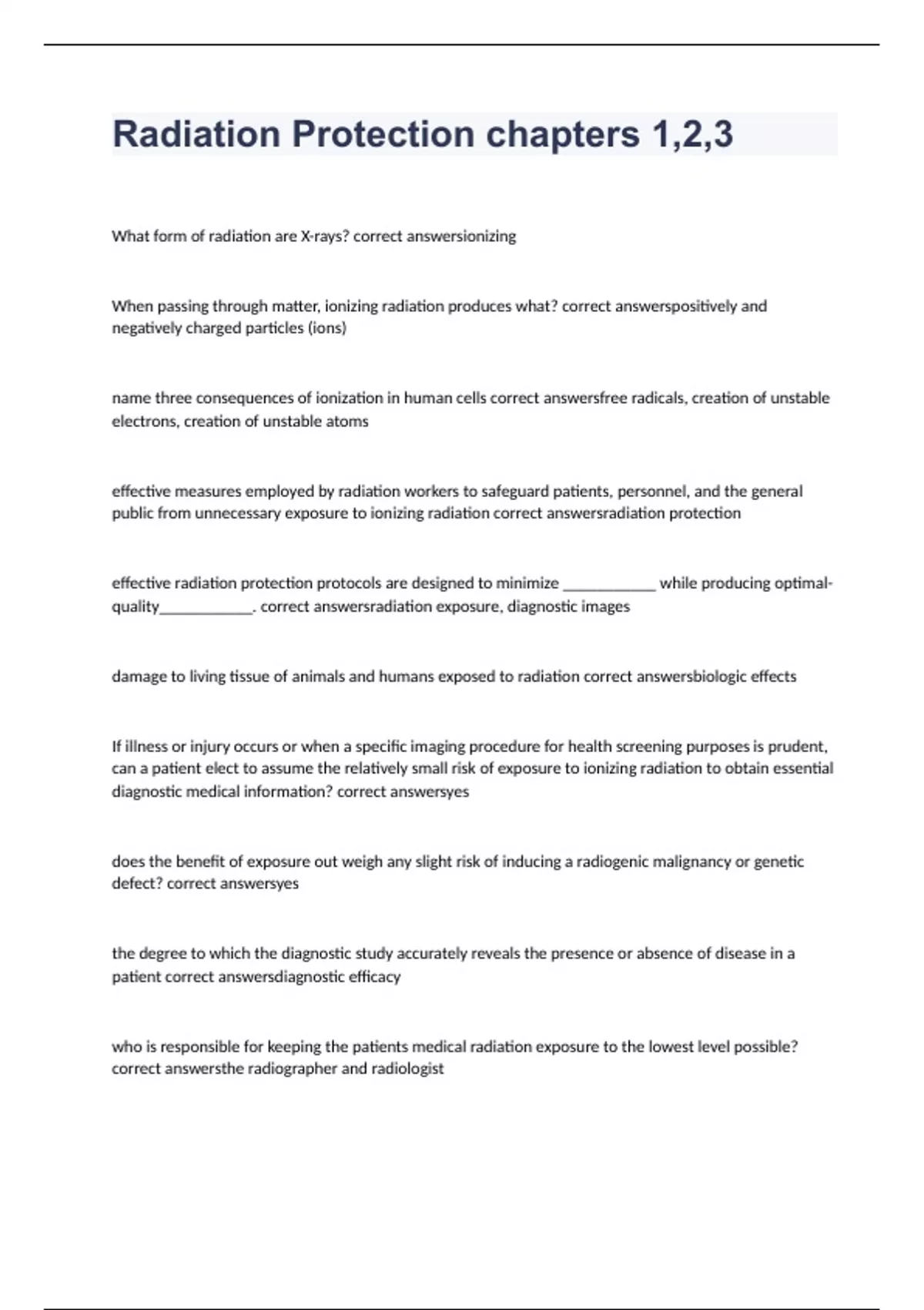 What form of radiation are X-rays? correct answersionizing When passing through matter, ionizing radiation produces what? correct answerspositively and negatively charged particles (ions) name three consequences of ionization in human cells correct answersfree radicals, creation of unstable electrons, creation of unstable atoms effective measures employed by radiation workers to safeguard patients, personnel, and the general public from unnecessary exposure to ionizing radiation correct answersradiation protection effective radiation protection protocols are designed to minimize ___________ while producing optimal-quality___________. correct answersradiation exposure, diagnostic images damage to living tissue of animals and humans exposed to radiation correct answersbiologic effects If illness or injury occurs or when a specific imaging procedure for health screening purposes is prudent, can a patient elect to assume the relatively small risk of exposure to ionizing radiation to obtain essential diagnostic medical information? correct answersyes does the benefit of exposure out weigh any slight risk of inducing a radiogenic malignancy or genetic defect? correct answersyes the degree to which the diagnostic study accurately reveals the presence or absence of disease in a patient correct answersdiagnostic efficacy who is responsible for keeping the patients medical radiation exposure to the lowest level possible? correct answersthe radiographer and radiologist