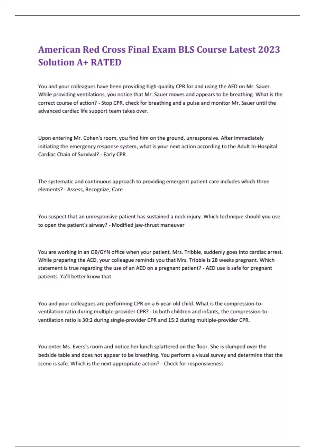 American Red Cross Final Exam BLS Course Latest 2023 SolYou and your colleagues have been providing high-quality CPR for and using the AED on Mr. Sauer. While providing ventilations, you notice that Mr. Sauer moves and appears to be breathing. What is the correct course of action? - Stop CPR, check for breathing and a pulse and monitor Mr. Sauer until the advanced cardiac life support team takes over. Upon entering Mr. Cohen's room, you find him on the ground, unresponsive. After immediately initiating the emergency response system, what is your next action according to the Adult In-Hospital Cardiac Chain of Survival? - Early CPR The systematic and continuous approach to providing emergent patient care includes which three elements? - Assess, Recognize, Care You suspect that an unresponsive patient has sustained a neck injury. Which technique should you use to open the patient's airway? - Modified jaw-thrust maneuverution A+ RATED