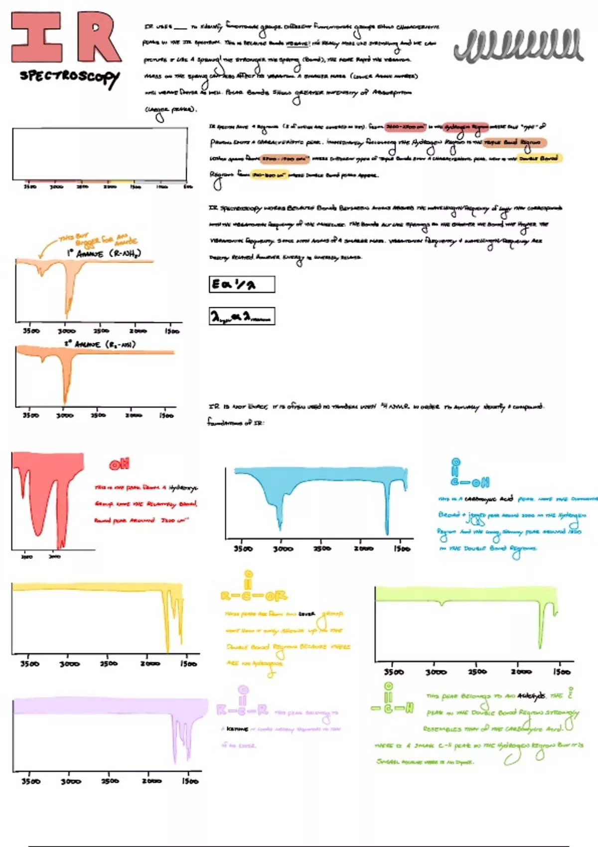 Condensed class notes from lectures about identification using IR spectroscopy, Includes typical peaks for important functional groups.