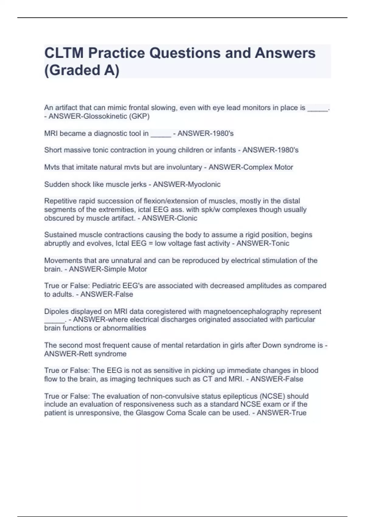 CLTM Practice Questions and Answers (Graded A)CLTM Practice Questions and Answers (Graded A)CLTM Practice Questions and Answers (Graded A)CLTM PraCLTM Practice Questions and Answers (Graded A)ctice Questions and Answers (Graded A) An artifact that can mimic frontal slowing, even with eye lead monitors in place is _____. - ANSWER-Glossokinetic (GKP) MRI became a diagnostic tool in _____ - ANSWER-1980's Short massive tonic contraction in young children or infants - ANSWER-1980's