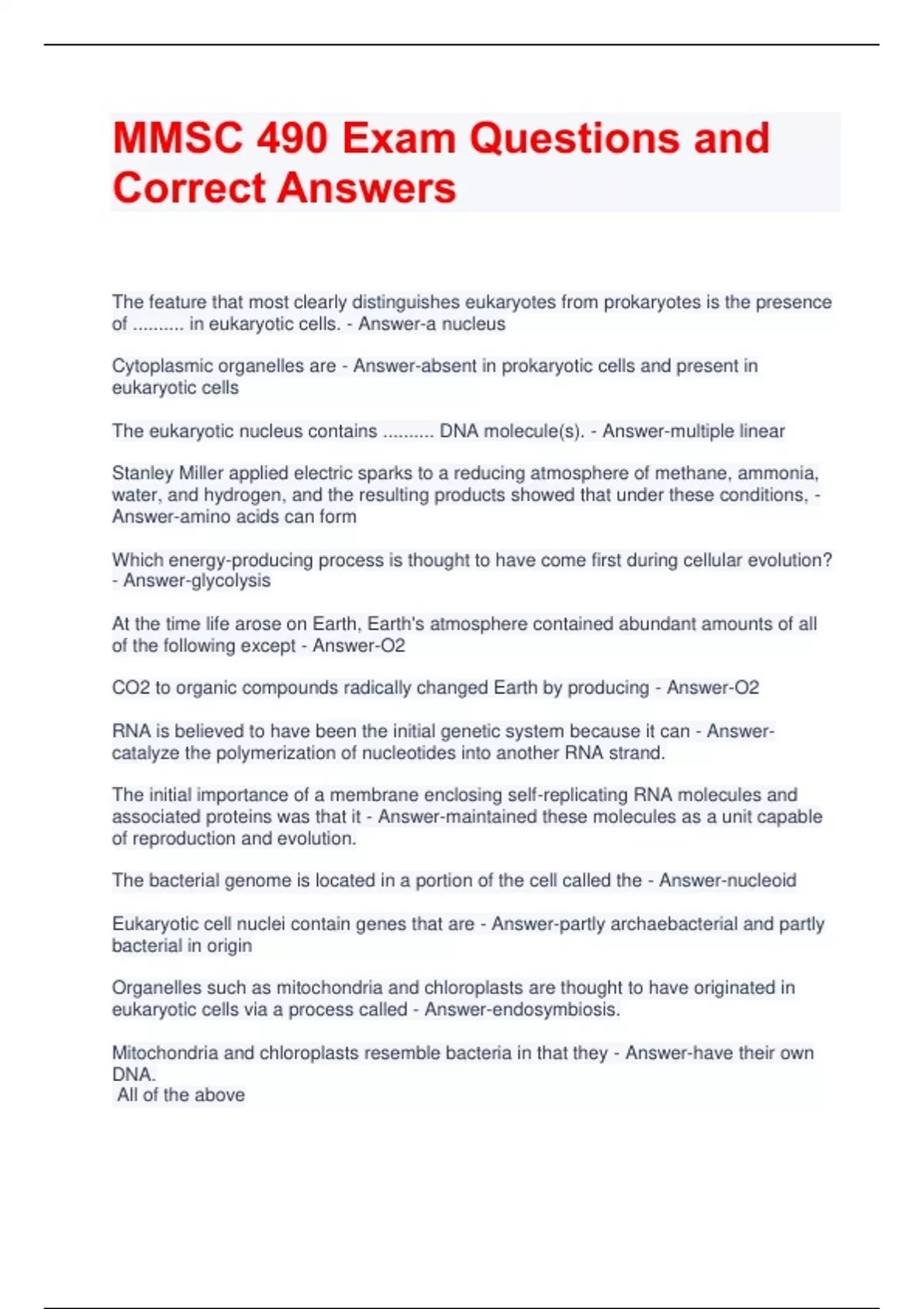 MMSC 490 Exam Questions and Correct Answers The feature that most clearly distinguishes eukaryotes from prokaryotes is the presence of .......... in eukaryotic cells. - Answer-a nucleus Cytoplasmic organelles are - Answer-absent in prokaryotic cells and present in eukaryotic cells The eukaryotic nucleus contains .......... DNA molecule(s). - Answer-multiple linear Stanley Miller applied electric sparks to a reducing atmosphere of methane, ammonia, water, and hydrogen, and the resulting products showed that under these conditions, - Answer-amino acids can form Which energy-producing process is thought to have come first during cellular evolution? - Answer-glycolysis At the time life arose on Earth, Earth's atmosphere contained abundant amounts of all of the following except - Answer-O2 CO2 to organic compounds radically changed Earth by producing - Answer-O2 RNA is believed to have been the initial genetic system because it can - Answercatalyze the polymerization of nucleotides into another RNA strand. The initial importance of a membrane enclosing self-replicating RNA molecules and associated proteins was that it - Answer-maintained these molecules as a unit capable of reproduction and evolution.