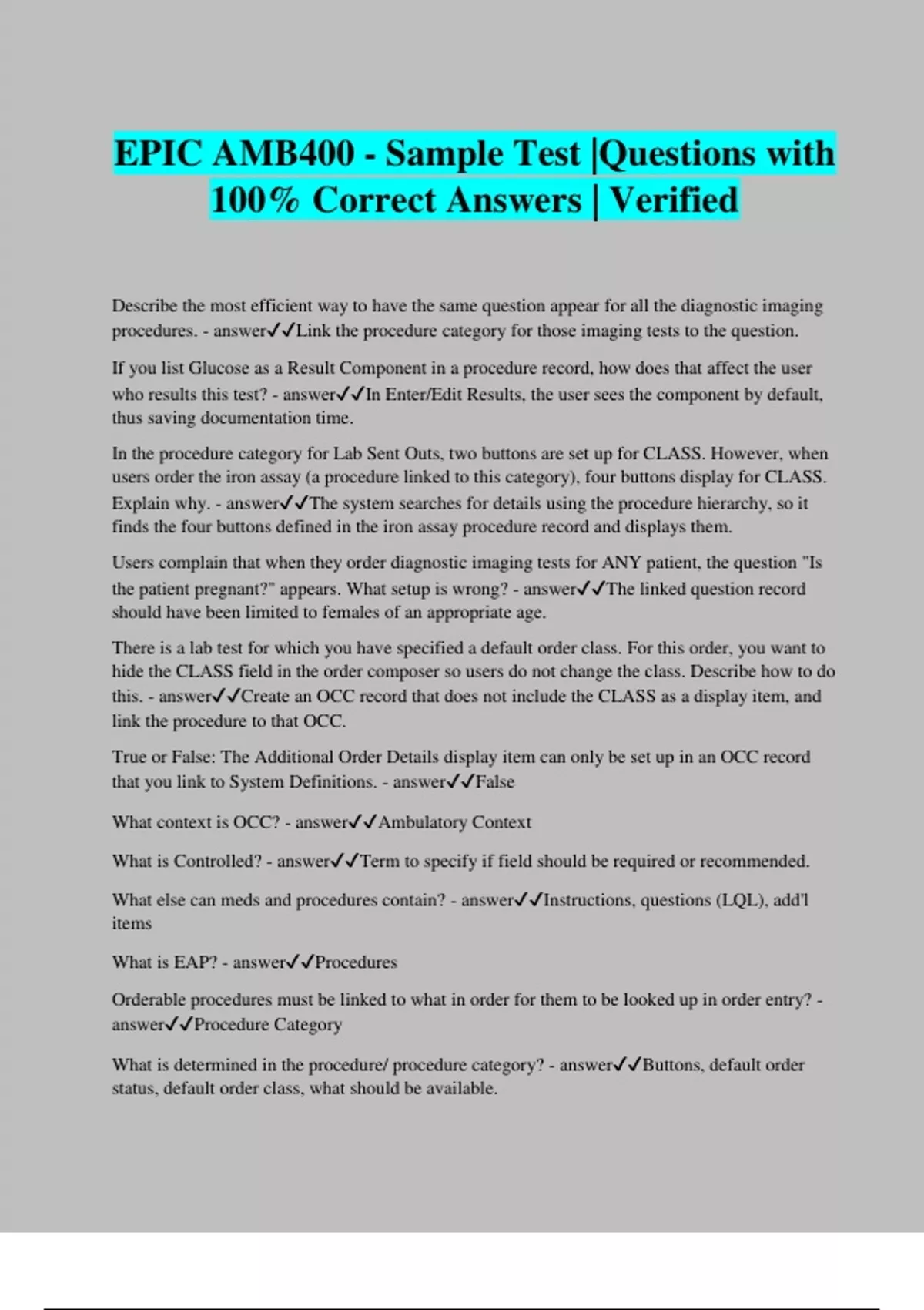 EPIC AMB400 - Sample Test |Questions with 100% Correct Answers | Verified Describe the most efficient way to have the same question appear for all the diagnostic imaging procedures. - answerLink the procedure category for those imaging tests to the question. If you list Glucose as a Result Component in a procedure record, how does that affect the user who results this test? - answerIn Enter/Edit Results, the user sees the component by default, thus saving documentation time. In the procedure category for Lab Sent Outs, two buttons are set up for CLASS. However, when users order the iron assay (a procedure linked to this category), four buttons display for CLASS. Explain why. - answerThe system searches for details using the procedure hierarchy, so it finds the four buttons defined in the iron assay procedure record and displays them. Users complain that when they order diagnostic imaging tests for ANY patient, the question "Is the patient pregnant?" appears. What setup is wrong? - answerThe linked question record should have been limited to females of an appropriate age. There is a lab test for which you have specified a default order class. For this order, you want to hide the CLASS field in the order composer so users do not change the class. Describe how to do this. - answerCreate an OCC record that does not include the CLASS as a display item, and link the procedure to that OCC. True or False: The Additional Order Details display item can only be set up in an OCC record that you link to System Definitions. - answerFalse What context is OCC? - answerAmbulatory Context What is Controlled? - answerTerm to specify if field should be required or recommended. What else can meds and procedures contain? - answerInstructions, questions (LQL), add'l items What is EAP? - answerProcedures Orderable procedures must be linked to what in order for them to be looked up in order entry? - answerProcedure Category What is determined in the procedure/ procedure category? - answerButtons, default order status, default order class, what should be available