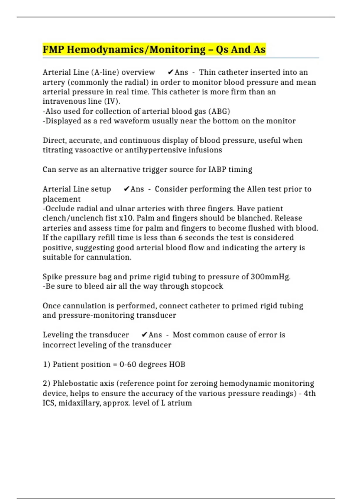 Arterial Line setup ✔️Ans - Consider performing the Allen test prior to