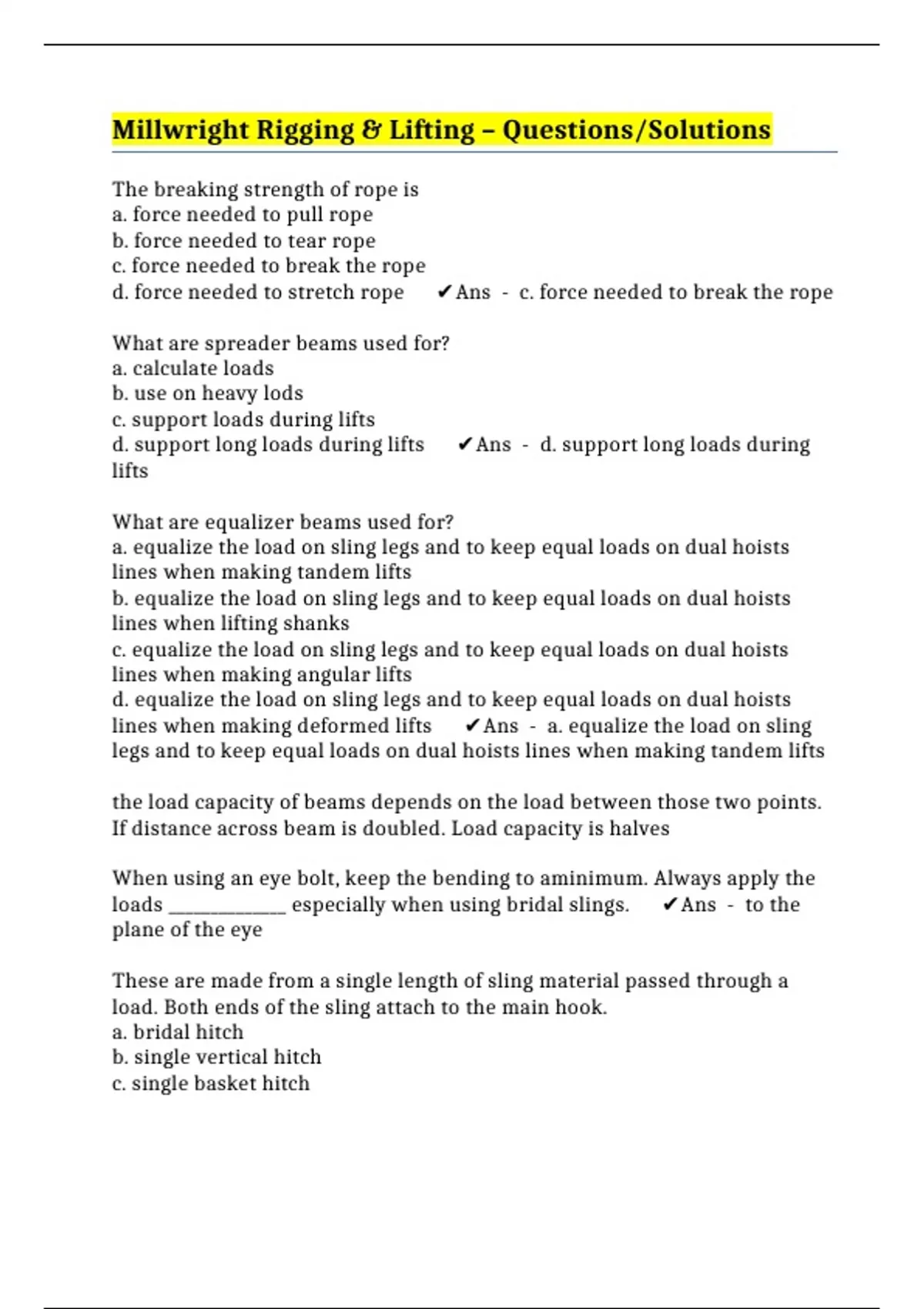 Millwright Rigging & Lifting – Questions/Solutions