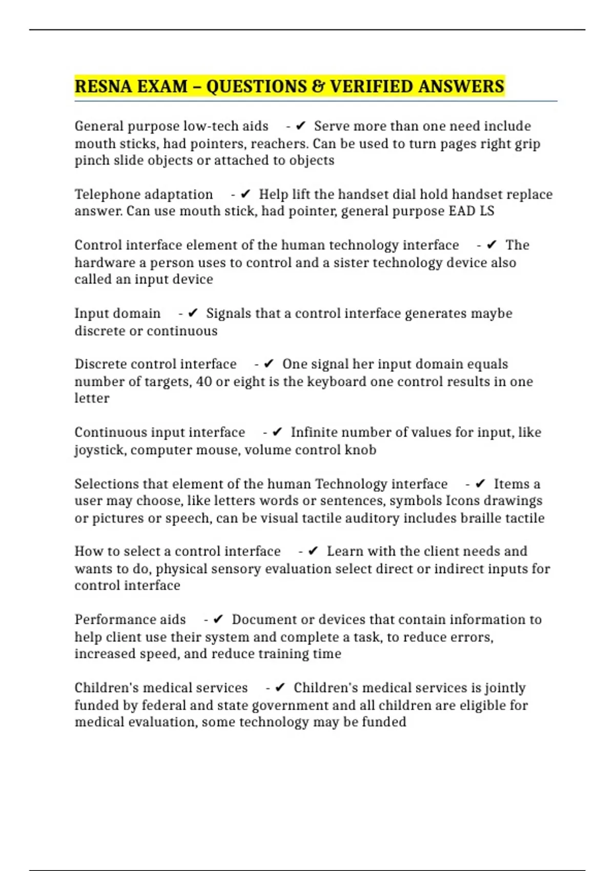 RESNA EXAM – QUESTIONS & VERIFIED ANSWERS