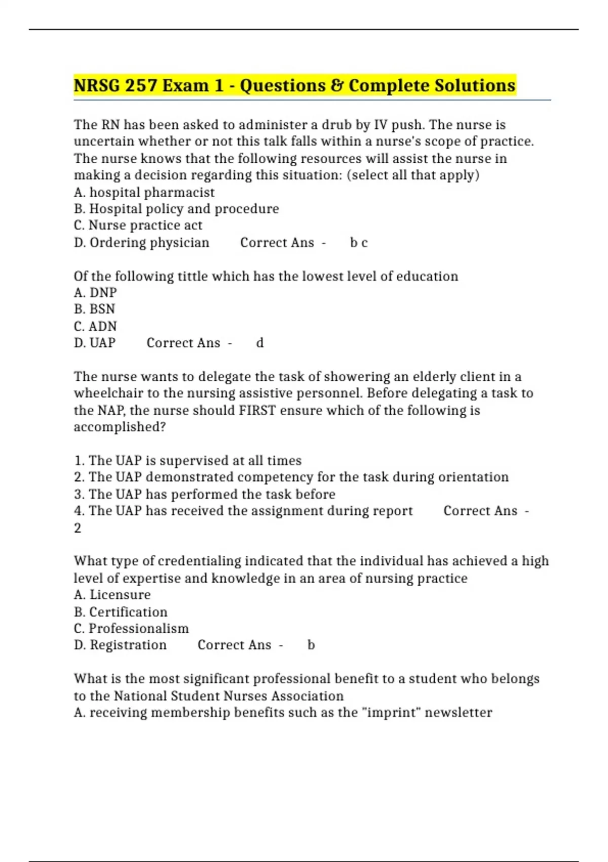 NRSG 257 Exam 1 - Questions & Complete Solutions