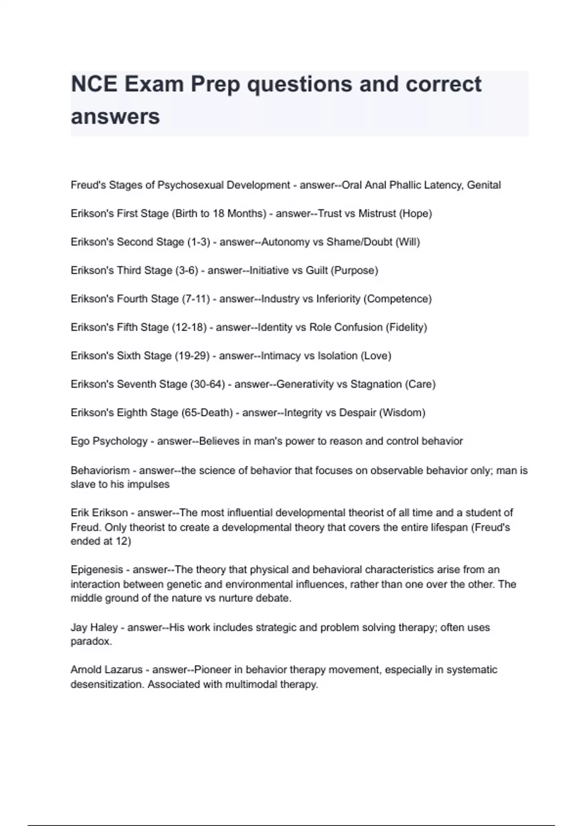 NCE Exam Prep questions and correct answers Freud's Stages of Psychosexual Development - answer--Oral Anal Phallic Latency, Genital Erikson's First Stage (Birth to 18 Months) - answer--Trust vs Mistrust (Hope) Erikson's Second Stage (1-3) - answer--Autonomy vs Shame/Doubt (Will) Erikson's Third Stage (3-6) - answer--Initiative vs Guilt (Purpose) Erikson's Fourth Stage (7-11) - answer--Industry vs Inferiority (Competence) Erikson's Fifth Stage (12-18) - answer--Identity vs Role Confusion (Fidelity) Erikson's Sixth Stage (19-29) - answer--Intimacy vs Isolation (Love) Erikson's Seventh Stage (30-64) - answer--Generativity vs Stagnation (Care)