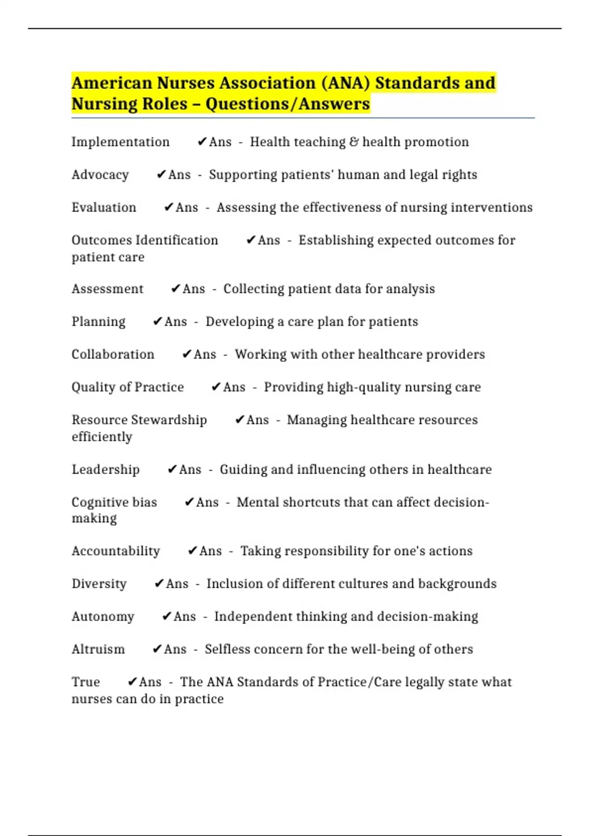 True ✔️Ans - The ANA Standards of Practice/Care legally state what