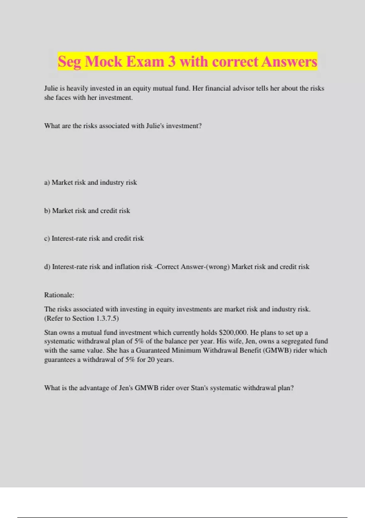 Seg Mock Exam 3 with correct Answers Julie is heavily invested in an equity mutual fund. Her financial advisor tells her about the risks she faces with her investment. What are the risks associated with Julie's investment? a) Market risk and industry risk b) Market risk and credit risk c) Interest-rate risk and credit risk d) Interest-rate risk and inflation risk -Correct Answer-(wrong) Market risk and credit risk Rationale: The risks associated with investing in equity investments are market risk and industry risk. (Refer to Section 1.3.7.5) Stan owns a mutual fund investment which currently holds $200,000. He plans to set up a systematic withdrawal plan of 5% of the balance per year. His wife, Jen, owns a segregated fund with the same value. She has a Guaranteed Minimum Withdrawal Benefit (GMWB) rider which guarantees a withdrawal of 5% for 20 years. What is the advantage of Jen's GMWB rider over Stan's systematic withdrawal plan? a) Jen is guaranteed a GMWB payment of a minimum of $10,000 for 20 years, provided she does not make any withdrawals from her account. b) The GMWB payout amount is recalculated every year. c) The GMWB payments of $10,000 a year will increase if she makes withdrawals from her account. d) The GMWB is the same as his systematic withdrawal plan. -Correct Answer-(correct) Jen is guaranteed a GMWB payment of a minimum of $10,000 for 20 years, provided she does not make any withdrawals from her account. Rationale: The GMWB is a guaranteed amount that the investor will receive during the period stated in the contract (e.g., 20 years). Extra withdrawals exceeding the guaranteed amount will reduce the future guaranteed income. The GMWB may be reset every three years if the market value of the contract has increased and additional withdrawals have not been made. The amount received from Stan's systematic withdrawal plan will fluctuate depending upon the market value of the fund. (Refer to Section 2.1.4.0) Nadia is meeting with her clients to implement the segregated funds recommendation that she made to them last week. During their last appointment, she gathered their financial information, and based on the information that her clients shared, she made a recommendation. Nadia has explained the benefits of segregated funds as well as the risks. She is now meeting with them to complete their application and get their signatures. Which step has Nadia forgotten to go through with her clients? a) Nadia needs to make sure that she delivers the information folder before signing the application. b) Nadia needs to review again the details of the segregated funds so that her clients clearly understand the risks. c) Nadia needs to make sure that her clients undergo medical underwriting to qualify. d) Nadia needs to give her clients the MER financial statement so that they are aware of the fees. -Correct Answer-(correct) Nadia needs to make sure that she delivers the information folder before signing the application. Rationale: Nadia needs to provide her clients with the fund facts either in person or via email. The clients have to also acknowledge that they have received them before they sign the application. (Refer to Section 5.2.11.1) contribute 5% of his earnings. He is planning to leave his employer for a higher paying job. Johnson wonders whether his GRRSP has vested and whether he has ownership rights on the employer's contributions. When do contributions to GRRSP