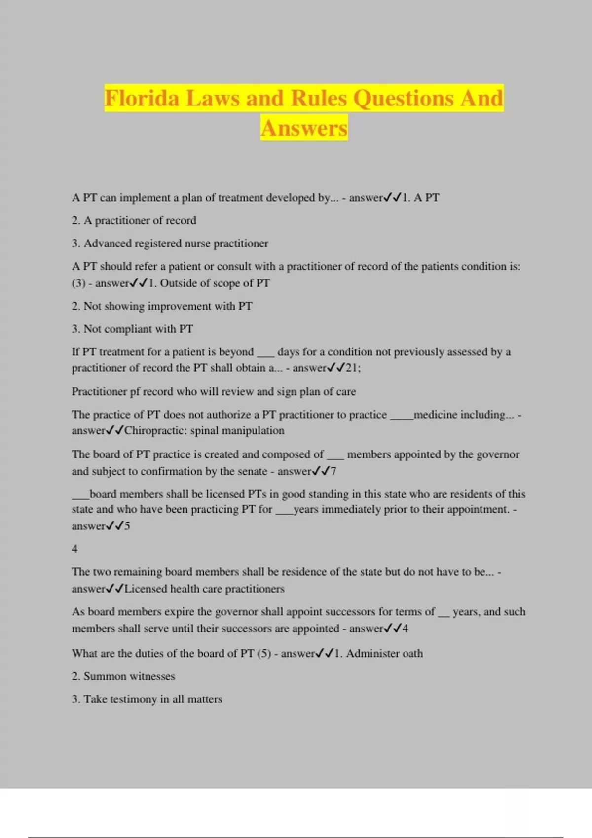 Florida Laws and Rules Questions And Answers A PT can implement a plan of treatment developed by... - answer1. A PT 2. A practitioner of record 3. Advanced registered nurse practitioner A PT should refer a patient or consult with a practitioner of record of the patients condition is: (3) - answer1. Outside of scope of PT 2. Not showing improvement with PT 3. Not compliant with PT If PT treatment for a patient is beyond ___ days for a condition not previously assessed by a practitioner of record the PT shall obtain a... - answer21; Practitioner pf record who will review and sign plan of care The practice of PT does not authorize a PT practitioner to practice ____medicine including... - answerChiropractic: spinal manipulation The board of PT practice is created and composed of ___ members appointed by the governor and subject to confirmation by the senate - answer7 ___board members shall be licensed PTs in good standing in this state who are residents of this state and who have been practicing PT for ___years immediately prior to their appointment. - answer5 4 The two remaining board members shall be residence of the state but do not have to be... - answerLicensed health care practitioners As board members expire the governor shall appoint successors for terms of __ years, and such members shall serve until their successors are appointed - answer4 What are the duties of the board of PT (5) - answer1. Administer oath 2. Summon witnesses 3. Take testimony in all matters 4. Establish minimum standards of practice and afoot rules 5. Review the standing of any school or college offering courses in PT to determine if they meet the standard What are PT requirements for licensure (4) - answer1. 18 years or older 2. Good moral character 3. Graduated from accredited PT school of the US and passed to the satisfaction of the board 4. Have a diploma from PT school in foreign country that have credentials equivalent to those required for educational preparation of PT How do PTs apply for a license - answerThe applicant shall pay to the department at the time of filing the application and a fee not to exceed $100, as fixed by the board What are the requirements for the physical therapy Board examination (4) - answer1. applicant must pass the exam 2. failure to pass the exam in three attempts, the applicant may not be eligible for re-examination unless she completes additional education or training requirements prescribed by the Board 3. after completing additional educational or training requirements prescribed by the board may take the exam on two more occasions 4. if the applicant has failed to pass the exam after 5 attempts she is no longer eligible to take exam How can a PT be issued a license (3) - answer1. the board shall issue a license through the department to each applicant who successfully establishes eligibility under the terms of this chapter and remits the initial license fee set by the board 2. fee for license should not exceed $150 3. after license is obtained the pursuant may engage in practice PT and use PT or physiotherapist in connection with her name How does a pursuant get issued a temporary permit (7) - answer1. Complete application for temp permit 2. Graduate from approved US PT education program 3. Submit an application for licensure 4. demonstrate proof of possessing malpractice insurance 5. Submit docs under board ruler verifying you will practice under the direct supervision of a licensed PT 6. A temporary permit is not renewable unless a valid license is granted by the board and is void if the permittee does not pass the NPTE within 6 months after graduation from PT school 7. An applicant for a PT permit cannot work as a PT until permit is issued by the board The supervising PT for a temporary license must be licensed for a minimum of __ months before the supervision period begins and must ____ records produced by the PT practicing under a temporary license - answer6 month