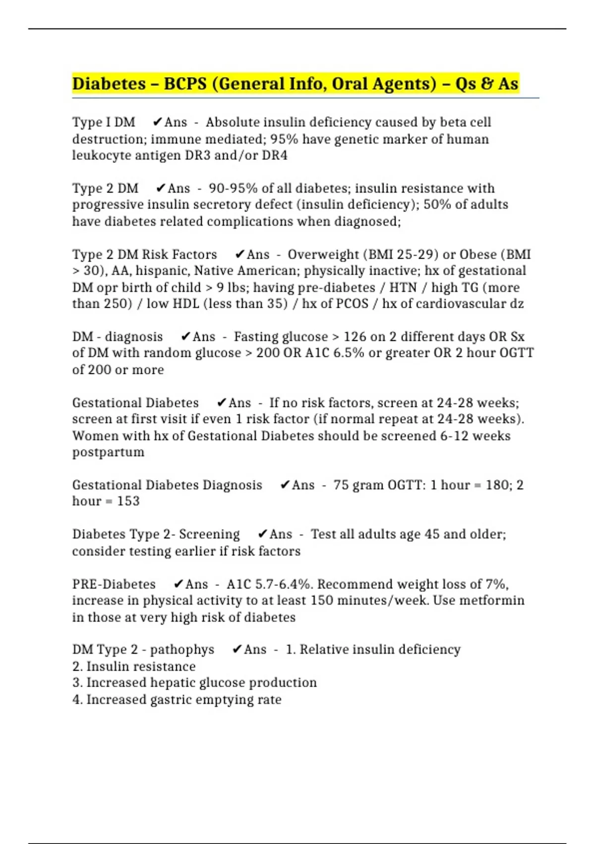 Diabetes – BCPS (General Info, Oral Agents) – Qs & As