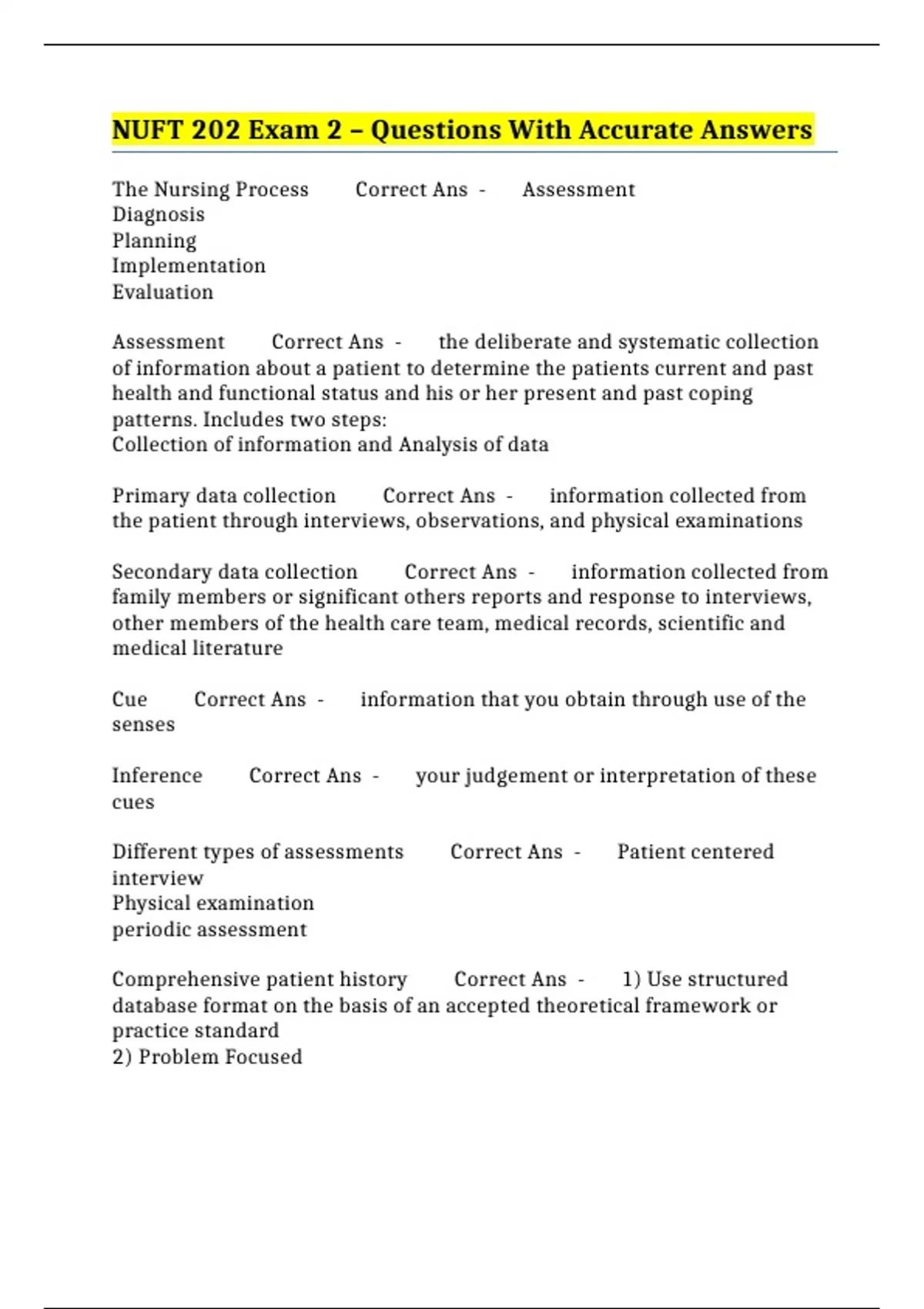 The Nursing Process Correct Ans - Assessment