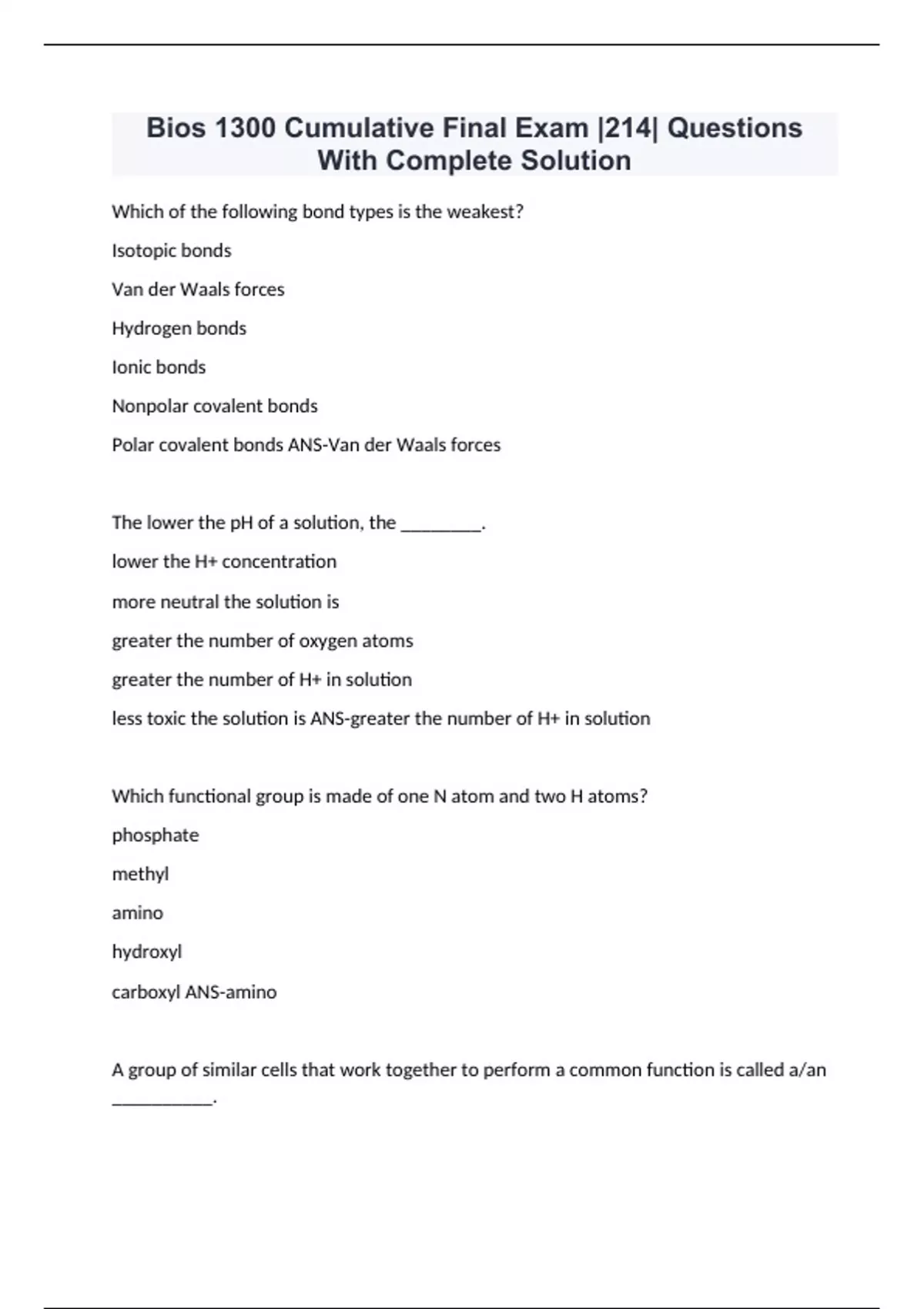 Bios 1300 Cumulative Final Exam |214| Questions With Complete Solution Which of the following bond types is the weakest? Isotopic bonds Van der Waals forces Hydrogen bonds Ionic bonds Nonpolar covalent bonds Polar covalent bonds ANS-Van der Waals forces The lower the pH of a solution, the ________. lower the H+ concentration more neutral the solution is greater the number of oxygen atoms greater the number of H+ in solution less toxic the solution is ANS-greater the number of H+ in solution Which functional group is made of one N atom and two H atoms? phosphate methyl amino hydroxyl carboxyl ANS-amino A group of similar cells that work together to perform a common function is called a/an __________. Or