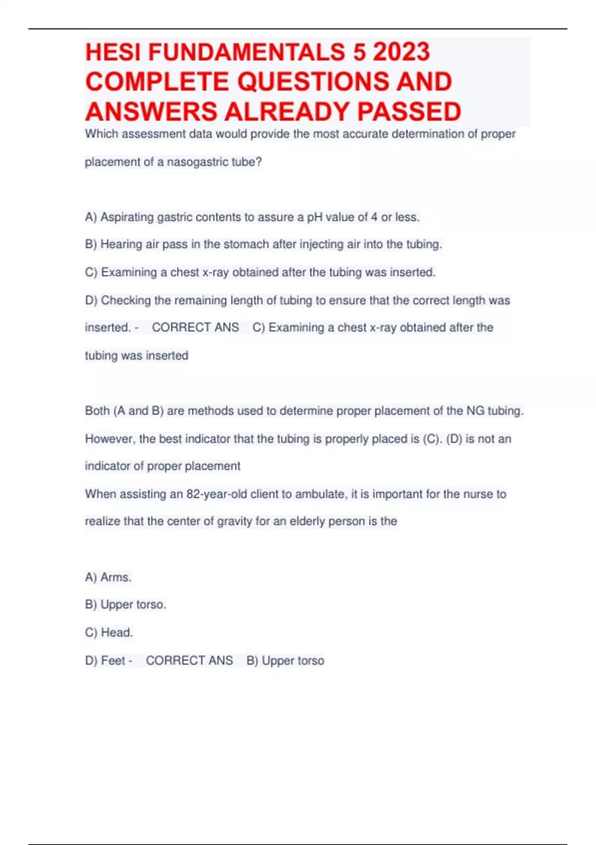 HESI FUNDAMENTALS 5 2023 COMPLETE QUESTIONS AND ANSWERS ALREADY PASSED Which assessment data would provide the most accurate determination of proper placement of a nasogastric tube? A) Aspirating gastric contents to assure a pH value of 4 or less. B) Hearing air pass in the stomach after injecting air into the tubing. C) Examining a chest x-ray obtained after the tubing was inserted. D) Checking the remaining length of tubing to ensure that the correct length was inserted. - CORRECT ANS C) Examining a chest x-ray obtained after the tubing was inserted Both (A and B) are methods used to determine proper placement of the NG tubing. However, the best indicator that the tubing is properly placed is (C). (D) is not an indicator of proper placement When assisting an 82-year-old client to ambulate, it is important for the nurse to realize that the center of gravity for an elderly person is the A) Arms. B) Upper torso. C) Head. D) Feet - CORRECT ANS B) Upper torso HESI FUNDAMENTALS 5 2023 COMPLETE QUESTIONS AND ANSWERS ALREADY PASSED The center of gravity for adults is the hips. However, as the person grows older, a stooped posture is common because of the changes from osteoporosis and normal bone degeneration, and the knees, hips, and elbows flex. This stooped posture results in the upper torso (B) becoming the center of gravity for older persons. Although (A) is a part, or an extension of the upper torso, this is not the best and most complete answer. Which action is most important for the nurse to implement when donning sterile gloves? A) Maintain thumb at a ninety degree angle. B) Hold hands with fingers down while gloving. C) Keep gloved hands above the elbows. D) Put the glove on the dominant hand first. - CORRECT ANS C) Keep gloved hands above the elbows Gloved hands held below waist level are considered unsterile (C). (A and B) are not essential to maintaining asepsis. While it may be helpful to put the glove on the dominant hand first, it is not necessary to ensure asepsis (D). An adult male client with a history of hypertension tells the nurse that he is tired of taking antihypertensive medications and is going to try spiritual meditation instead. What should be the nurse's first response? HESI FUNDAMENTALS 5 2023 COMPLETE QUESTIONS AND ANSWERS ALREADY PASSED A) It is important that you continue your medication while learning to meditate. B) Spiritual meditation requires a time commitment of 15 to 20 minutes daily. C) Obtain your healthcare provider's permission before starting meditation. D) Complementary therapy and western medicine can be effective for you. - CORRECT ANS A) It is important that you continue your medication while learning to meditate The prolonged practice of meditation may lead to a reduced need for antihypertensive medications. However, the medications must be continued (A) while the physiologic response to meditation is monitored. (B) is not as important as continuing the medication. The healthcare provider should be informed, but permission is not required to meditate (C). Although it is true that this complimentary therapy might be effective (D), it is essential that the client continue with antihypertensive medications until the effect of meditation can be measured The nurse plans to obtain health assessment information from a primary source. Which option is a primary source for the completion of the health assessment? A) Client. B) Healthcare provider. C) A family member. D) Previous medical records - CORRECT ANS A) Client