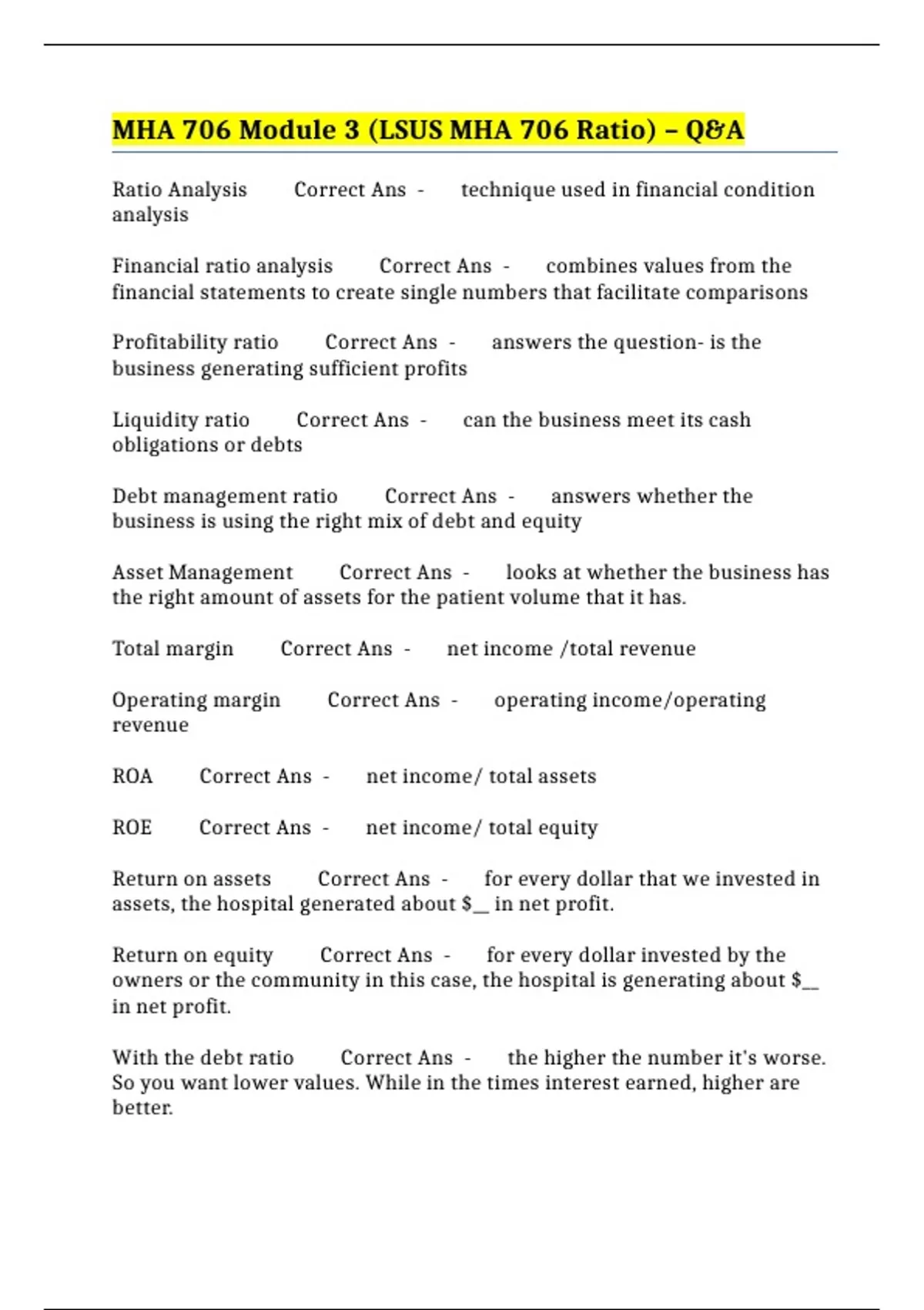 MHA 706 Module 3 (LSUS MHA 706 Ratio) – Q&A