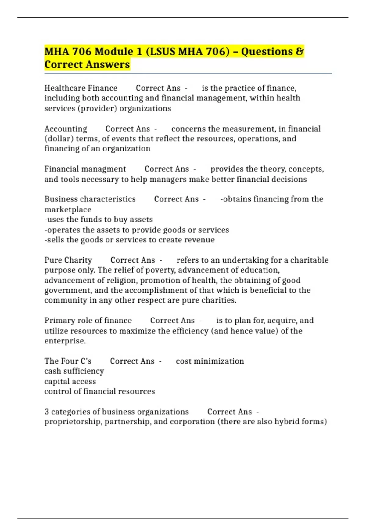MHA 706 Module 1 (LSUS MHA 706) – Questions &