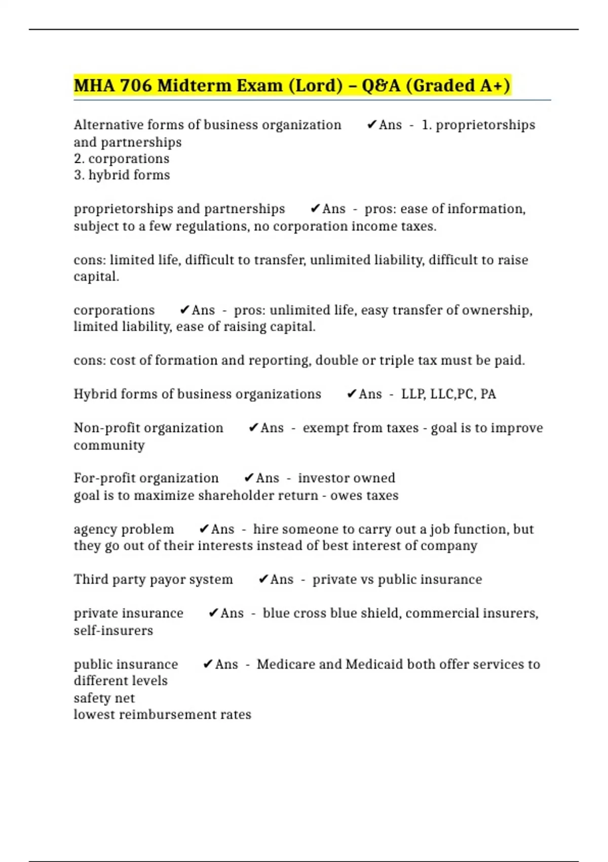 Hybrid forms of business organizations ✔️Ans - LLP, LLC,PC, PA