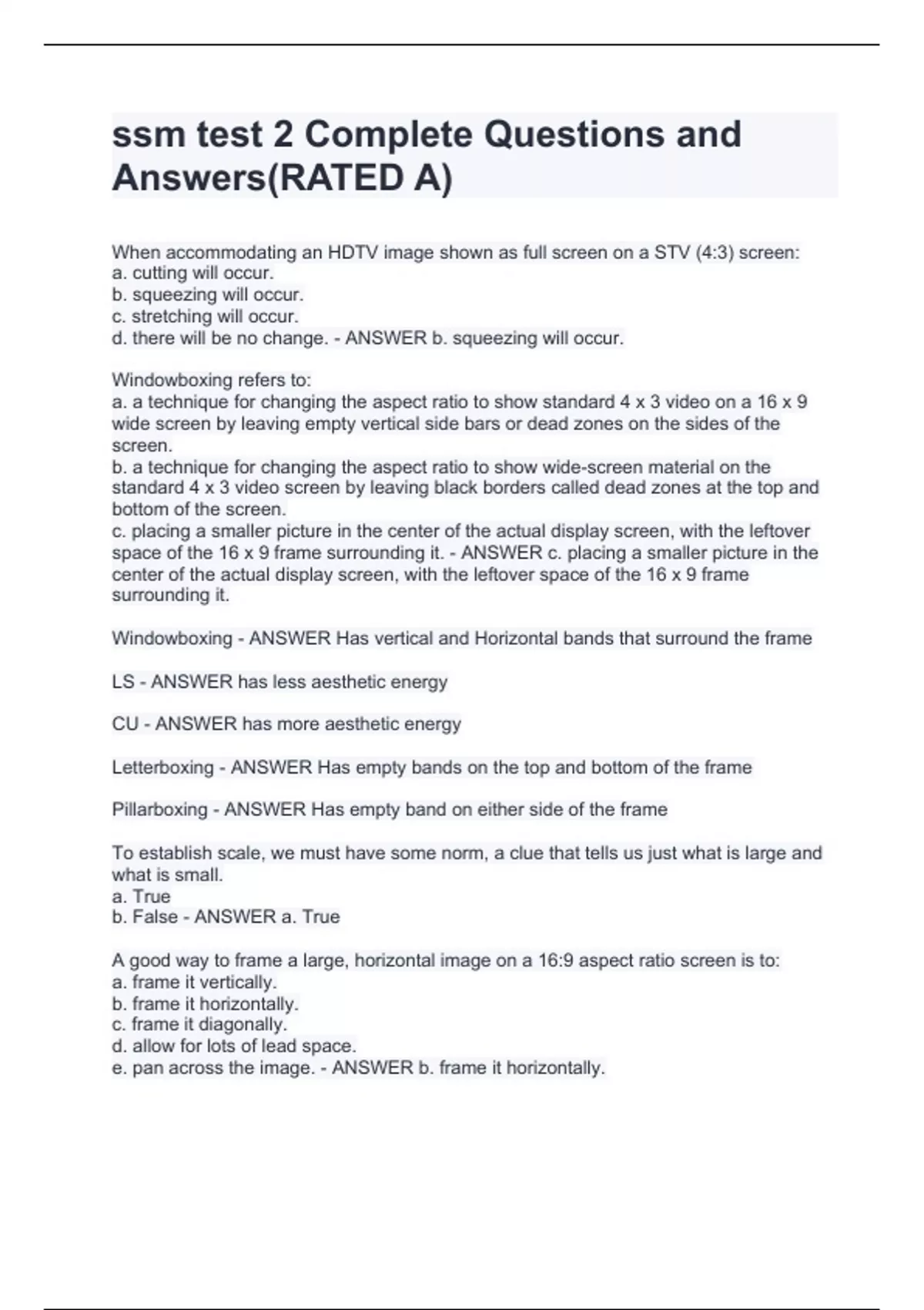 ssm test 2 Complete Questions and Answers(RATED A) When accommodating an HDTV image shown as full screen on a STV (4:3) screen: a. cutting will occur. b. squeezing will occur. c. stretching will occur. d. there will be no change. - ANSWER b. squeezing will occur. Windowboxing refers to: a. a technique for changing the aspect ratio to show standard 4 x 3 video on a 16 x 9 wide screen by leaving empty vertical side bars or dead zones on the sides of the screen. b. a technique for changing the aspect ratio to show wide-screen material on the standard 4 x 3 video screen by leaving black borders called dead zones at the top and bottom of the screen. c. placing a smaller picture in the center of the actual display screen, with the leftover space of the 16 x 9 frame surrounding it. - ANSWER c. placing a smaller picture in the center of the actual display screen, with the leftover space of the 16 x 9 frame surrounding it. Windowboxing - ANSWER Has vertical and Horizontal bands that surround the frame LS - ANSWER has less aesthetic energy CU - ANSWER has more aesthetic energy Letterboxing - ANSWER Has empty bands on the top and bottom of the frame Pillarboxing - ANSWER Has empty band on either side of the frame To establish scale, we must have some norm, a clue that tells us just what is large and what is small. a. True b. False - ANSWER a. True A good way to frame a large, horizontal image on a 16:9 aspect ratio screen is to: a. frame it vertically. b. frame it horizontally. c. frame it diagonally. d. allow for lots of lead space. e. pan across the image. - ANSWER b. frame it horizontally. Letterboxing refers to: a. a technique for changing the aspect ratio to show standard 4 x 3 video on a 16 x 9 wide screen by leaving empty vertical side bars or dead zones on the sides of the screen. b. a technique for changing the aspect ratio to show wide-screen material on the standard 4 x 3 video screen by leaving black borders called dead zones at the top and bottom of the screen. c. placing a smaller picture in the center of the actual display screen, with the leftover space of the 16 x 9 frame surrounding it. - ANSWER b. a technique for changing the