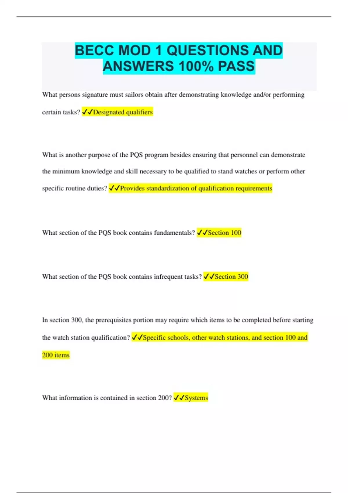 BECC MOD 1 QUESTIONS AND ANSWERS 100% PASS What persons signature must sailors obtain after demonstrating knowledge and/or performing certain tasks? Designated qualifiers What is another purpose of the PQS program besides ensuring that personnel can demonstrate the minimum knowledge and skill necessary to be qualified to stand watches or perform other specific routine duties? Provides standardization of qualification requirements What section of the PQS book contains fundamentals? Section 100 What section of the PQS book contains infrequent tasks? Section 300 In section 300, the prerequisites portion may require which items to be completed before starting the watch station qualification? Specific schools, other watch stations, and section 100 and 200 items What information is contained in section 200? Systems What type of change only requires that any new publications are changed? Errata What is the last step in the qualification process? Service record entry What individual indoctrinates the trainee in the PQS program? Supervisor Who is the point of contact within the command on all matters of PQS administration? PQS coordinator Who is ultimately in charge of the PQS program within the command? Commanding officer What is the role of the PQS qualifier? Provides expertise in a specific area of qualification Which of these are administrative controls that can be used to address a noise hazardous area? Periodic hearing testing, education/training, and hearing protective devices Which of the following are requirements of the hearing conservation program? Survey work environments, modify environments and equipment to reduce noise level, and education/training Which of the following hearing tests is used to establish your baseline? Hearing test upon entry into the navy Which two hearing tests do you receive, even if you are never exposed to a noise hazardous area? Upon entry into service and upon exit from military service What term describes physical exclusion? Auditory rest What maximum noise levels are you excluded from prior to the retest? 80 dB What is the period for limited duty noise exclusion, if needed? Minimum of 14 hours Which of the following properly state why hearing tests are conducted? To track program effectiveness, to detect the early onset of an STS, and to prevent further hearing loss The detailed surveillance program accomplishes which of the following options? Discovers reason for STS, recommends a corse of action, and determines best interest of the navy and the individual At which of these continuous noise levels is it mandatory for you to wear double hearing protection? 104dB In which of these environments must you always wear single hearing protective devices? If you enter or work in an area where continuous noise levels are 84dB (or greater) and/or impulse/impact noise levels are 140dB or greater Hazard labels are found in areas and on equipment where noise levels or, sound pressure levels, exceed which of these levels? More than 84dB and