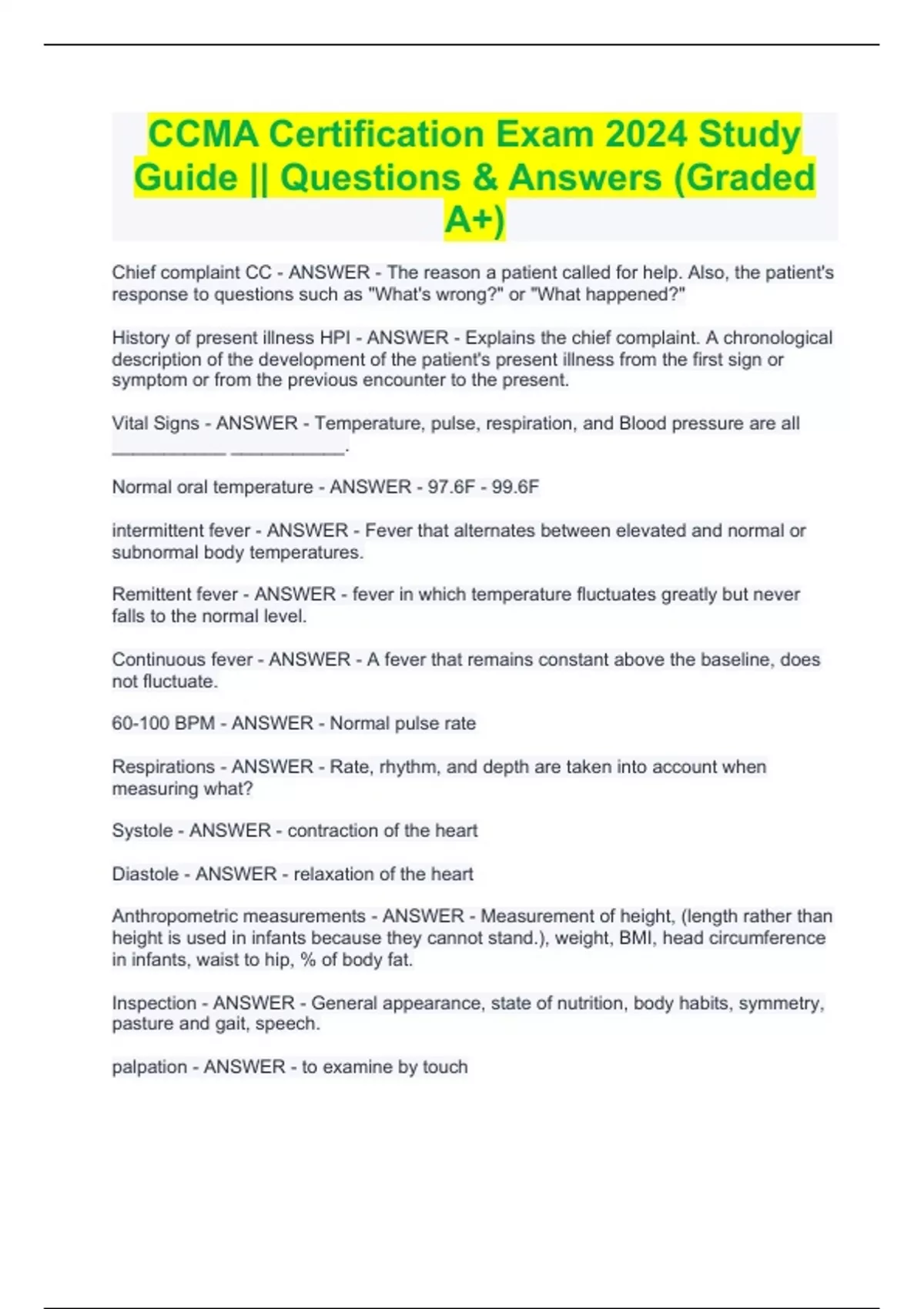 CCMA Certification Exam 2024 Study Guide || Questions & Answers (Graded A+) CCMA Certification Exam 2024 Study Guide || Questions & Answers (Graded A+) Chief complaint CC - ANSWER - The reason a patient called for help. Also, the patient's response to questions such as "What's wrong?" or "What happened?" History of present illness HPI - ANSWER - Explains the chief complaint. A chronological description of the development of the patient's present illness from the first sign or symptom or from the previous encounter to the present. Vital Signs - ANSWER - Temperature, pulse, respiration, and Blood pressure are all ___________ ___________. Normal oral temperature - ANSWER - 97.6F - 99.6F intermittent fever - ANSWER - Fever that alternates between elevated and normal or subnormal body temperatures. Remittent fever - ANSWER - fever in which temperature fluctuates greatly but never falls to the normal level. Continuous fever - ANSWER - A fever that remains constant above the baseline, does not fluctuate. 60-100 BPM - ANSWER - Normal pulse rate Respirations - ANSWER - Rate, rhythm, and depth are taken into account when measuring what? Systole - ANSWER - contraction of the heart Diastole - ANSWER - relaxation of the heart Anthropometric measurements - ANSWER - Measurement of height, (length rather than height is used in infants because they cannot stand.), weight, BMI, head circumference in infants, waist to hip, % of body fat. Inspection - ANSWER - General appearance, state of nutrition, body habits, symmetry, pasture and gait, speech. palpation - ANSWER - to examine by touch
