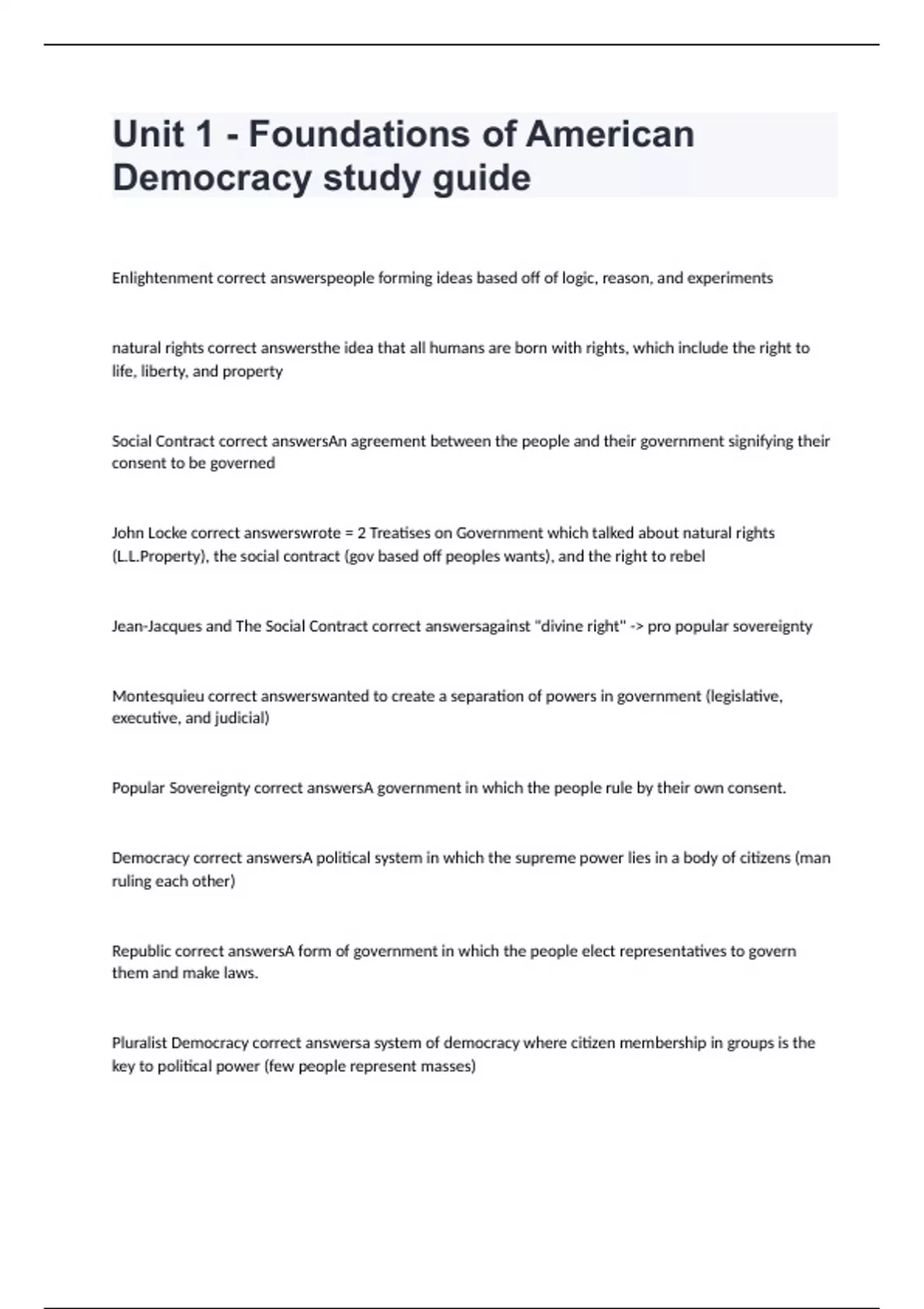 Unit 1 - Foundations of American Democracy study guide with complete solutions