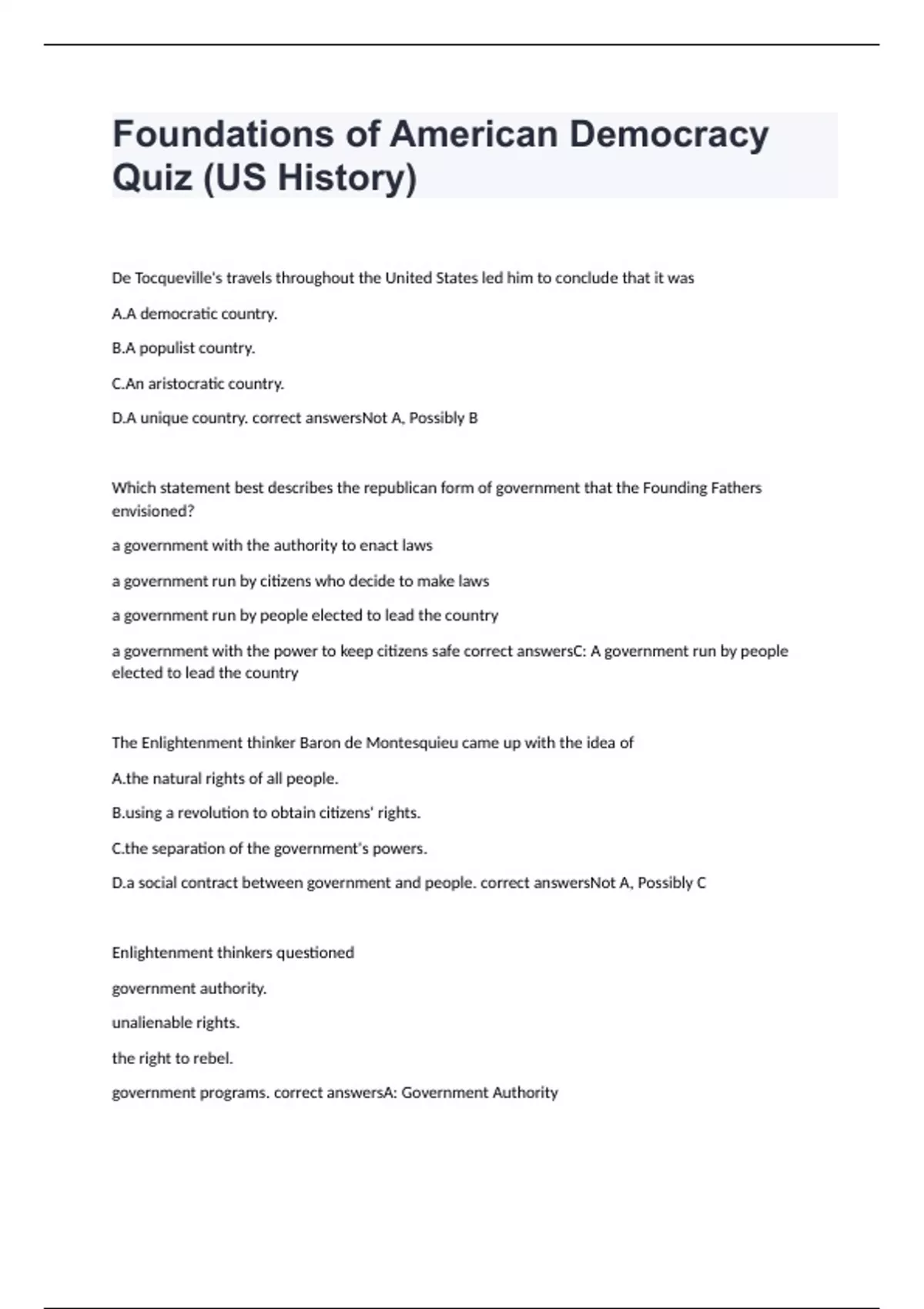De Tocqueville's travels throughout the United States led him to conclude that it was A.A democratic country. B.A populist country. C.An aristocratic country. D.A unique country. correct answersNot A, Possibly B Which statement best describes the republican form of government that the Founding Fathers envisioned? a government with the authority to enact laws a government run by citizens who decide to make laws a government run by people elected to lead the country a government with the power to keep citizens safe correct answersC: A government run by people elected to lead the country The Enlightenment thinker Baron de Montesquieu came up with the idea of A.the natural rights of all people. B.using a revolution to obtain citizens' rights. C.the separation of the government's powers. D.a social contract between government and people. correct answersNot A, Possibly C Enlightenment thinkers questioned government authority. unalienable rights. the right to rebel. government programs. correct answersA: Government Authority