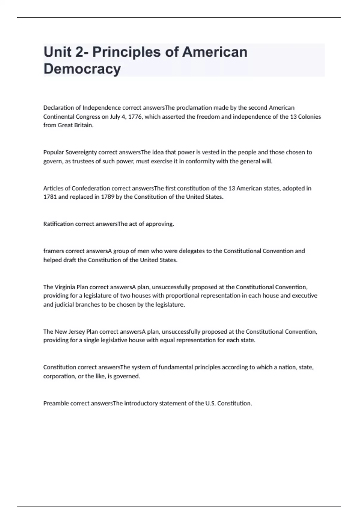 Declaration of Independence correct answersThe proclamation made by the second American Continental Congress on July 4, 1776, which asserted the freedom and independence of the 13 Colonies from Great Britain. Popular Sovereignty correct answersThe idea that power is vested in the people and those chosen to govern, as trustees of such power, must exercise it in conformity with the general will. Articles of Confederation correct answersThe first constitution of the 13 American states, adopted in 1781 and replaced in 1789 by the Constitution of the United States. Ratification correct answersThe act of approving. framers correct answersA group of men who were delegates to the Constitutional Convention and helped draft the Constitution of the United States. The Virginia Plan correct answersA plan, unsuccessfully proposed at the Constitutional Convention, providing for a legislature of two houses with proportional representation in each house and executive and judicial branches to be chosen by the legislature. The New Jersey Plan correct answersA plan, unsuccessfully proposed at the Constitutional Convention, providing for a single legislative house with equal representation for each state. Constitution correct answersThe system of fundamental principles according to which a nation, state, corporation, or the like, is governed.
