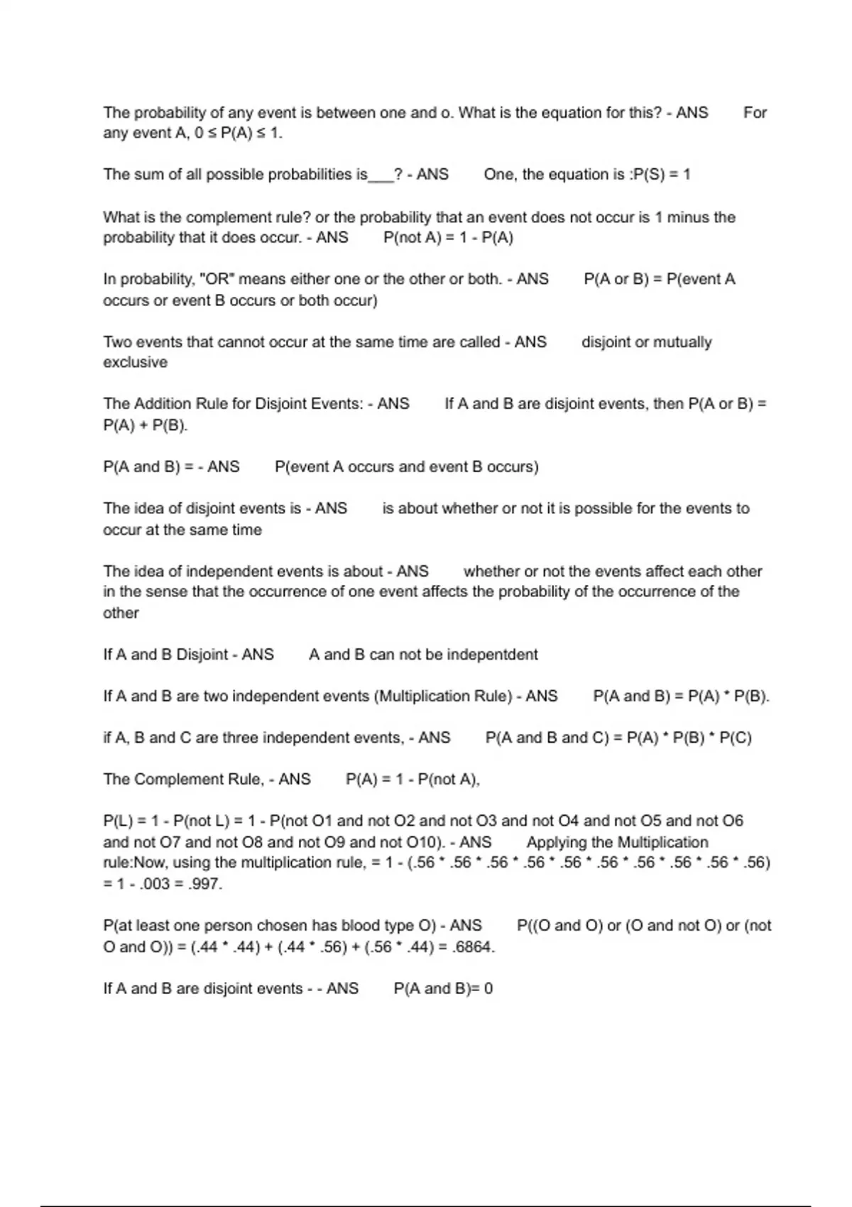 The probability of any event is between one and o. What is the equation for this? - ANS For any event A, 0 ≤ P(A) ≤ 1. The sum of all possible probabilities is___? - ANS One, the equation is :P(S) = 1 What is the complement rule? or the probability that an event does not occur is 1 minus the probability that it does occur. - ANS P(not A) = 1 - P(A) In probability, "OR" means either one or the other or both. - ANS P(A or B) = P(event A occurs or event B occurs or both occur) Two events that cannot occur at the same time are called - ANS disjoint or mutually exclusive The Addition Rule for Disjoint Events: - ANS If A and B are disjoint events, then P(A or B) = P(A) + P(B). P(A and B) = - ANS P(event A occurs and event B occurs) The idea of disjoint events is - ANS is about whether or not it is possible for the events to occur at the same time The idea of independent events is about - ANS whether or not the events affect each other in the sense that the occurrence of one event affects the probability of the occurrence of the other If A and B Disjoint - ANS A and B can not be indepentdent If A and B are two independent events (Multiplication Rule) - ANS P(A and B) = P(A) * P(B). if A, B and C are three independent events, - ANS P(A and B and C) = P(A) * P(B) * P(C) The Complement Rule, - ANS P(A) = 1 - P(not A), P(L) = 1 - P(not L) = 1 - P(not O1 and not O2 and not O3 and not O4 and not O5 and not O6 and not O7 and not O8 and not O9 and not O10). - ANS Applying the Multiplication rule:Now, using the multiplication rule, = 1 - (.56 * .56 * .56 * .56 * .56 * .56 * .56 * .56 * .56 * .56) = 1 - .003 = .997. P(at least one person chosen has blood type O) - ANS P((O and O) or (O and not O) or (not O and O)) = (.44 * .44) + (.44 * .56) + (.56 * .44) = .6864. If A and B are disjoint events - - ANS P(A and B)= 0 The General Addition Rule states that for any two events, - ANS P(A or B) = P(A) + P(B) - P(A and B) When each of two outcomes has two possible values (yes/no), - ANS there are four possible combinations altogether, which correspond to the four possible outcomes. How do we build a two-way table of probabilities? - ANS Horizontally, A, not A and total, Vertically, B. not B and total In a two-way table of probabilities, what is the total of all outcomes (lower right corner?) - ANS 1 Two events A and B are independent if any one of the following hold: - ANS P(B | A) = P(B) P(A | B) = P(A) P(B | A) = P(B | not A) P(A and B) = P(A) * P(B) In general, another method for checking the independence of events A and B is to compare - ANS P(A and B) to P(A) * P(B). If the two are equal, then A and B are independent, otherwise the two are not independent. "one in every thousand people (0.001) of all individuals are infected with HIV (H) - give equasion - ANS P(H) = .001 If someone actually has HIV, the probability of testing positive is .95" (H) give equasion - ANS P(T | H) = .95 Use the General Multiplication Rule to find the probability that someone chosen at random from the population has HIV and tests positive. (H is HIV positive and probability of HIV+ test accuracy is .95) - ANS P(H and T) = P(H) * P(T given H) = .001 x .95 = .00095. IF person is HIV positive and test accuracy is .95, what are the chances that that person will test negative (give equation) - ANS P(not T | H) = 1 - P(T | H) = 1 - .95 = .05. In a probability tree, the probabilities in the first branch-off are - ANS non-conditional probabilities In a probability tree,second branch-off are - ANS conditional probabilities. In a probability tree, the second thing to note is that probabilities of branches that branch out from the same point always add up to - ANS one WGU statistics In a probability tree, symbolically, V = (C and V) or (not C and V). Thus, the overall probability of taking the vacation is - ANS P(V) = P( (C and V) or (not C and V) ). In a probability tree, overall probability of V, in the event of C or not C is determined by what sequence of equasions? - ANS Applying the Addition Rule for Disjoint Events, we have P(V) = P(C and V) + P(not C and V). Applying the General Multiplication Rule to each term, we have P(V) = P(C) * P(V | C) + P(not C) * P(V | not C) A histogram is a display of - ANS a single quantitative variable A scatterplot is a display of - ANS two quantitative variables A two way table is a display of - ANS the relationship of two variables that are both categorical The appropriate display for the relationship between two variables based upon their type (Quantitative or categorical) and their role (explanatory or response) is - ANS side by side box plots What are the two simple graphical displays for visualizing the distribution of categorical data? - ANS The pie chart and the bar chart How does one calculate the standard deviation? - ANS Square each of the deviations: then,Average the square deviations by adding them up, and dividing by n - 1, (one less than the sample size): By distribution of a variable, we mean - ANS what values the variable takes and how often the variable takes those values A pie chart is a display for - ANS visualizing the distribution of categorical data pictogram - ANS is a variation of a pie chart, but can be misleading The three displays for one quantitative variable are - ANS histogram, stemplot and box plot symetric distributions for one quantitative variable can be shaped in how many ways? - ANS Symmetric (unimodal), single peaked, Symmetric (Bimodal) Double peaked and Symmetric uniform distribution A right skew distribution - ANS has a tail that curves down to the right A left skewed distribution - ANS Has a tail which curves up to the left. Can skewed distribution be bimodal? - ANS yes Spread (Also called variability) - ANS can be described by the approximate range covered by the data. In stemplots, - ANS the leaf is the right-most digit The stem is everything but - ANS the right -most digit To make a stem plot - ANS 1. Separate each observation into a stem and a leaf 2. Wr