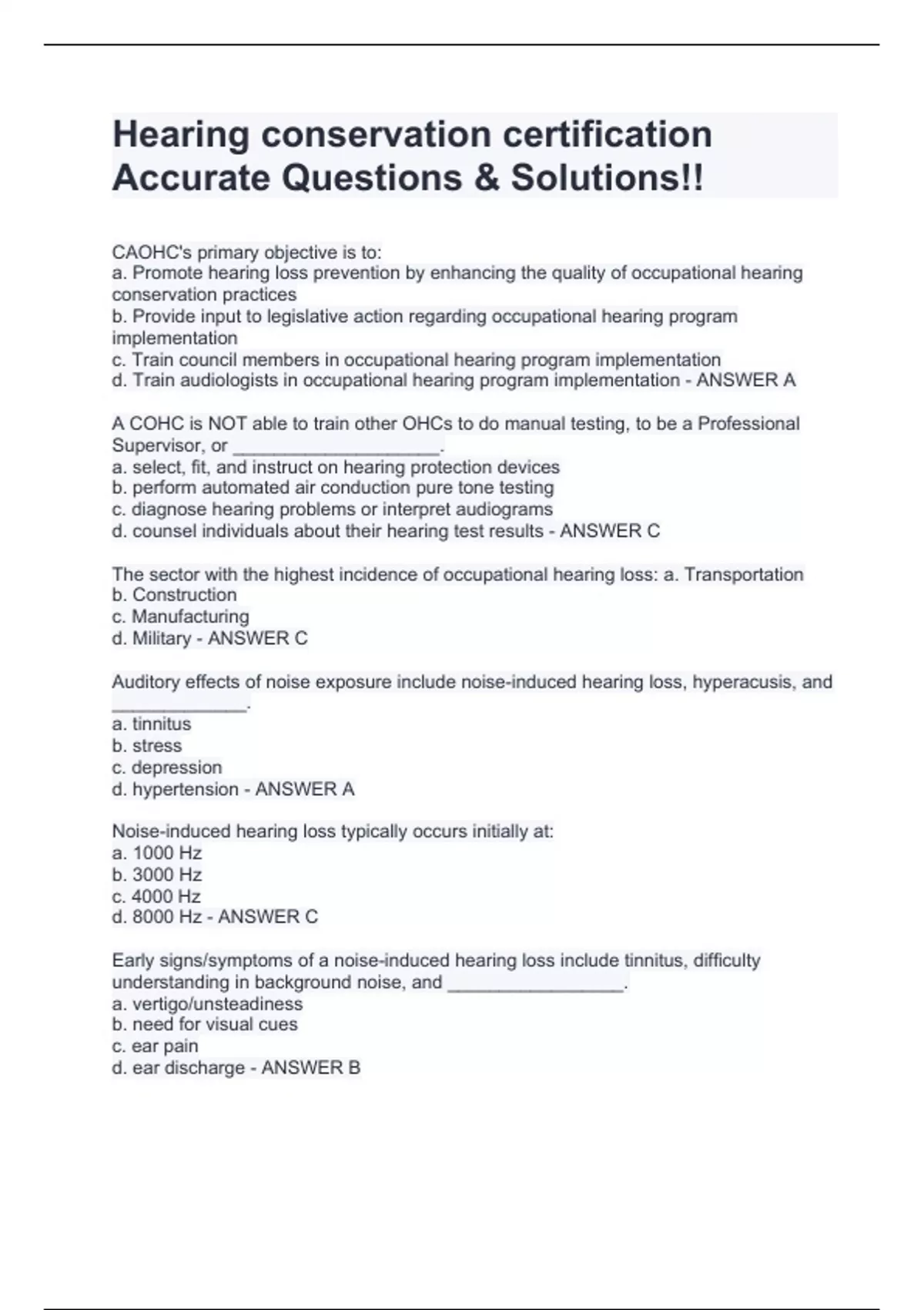 Hearing conservation certification Accurate QuCAOHC's primary objective is to: a. Promote hearing loss prevention by enhancing the quality of occupational hearing conservation practices b. Provide input to legislative action regarding occupational hearing program implementation c. Train council members in occupational hearing program implementation d. Train audiologists in occupational hearing program implementation - ANSWER A A COHC is NOT able to train other OHCs to do manual testing, to be a Professional Supervisor, or ____________________. a. select, fit, and instruct on hearing protection devices b. perform automated air conduction pure tone testing c. diagnose hearing problems or interpret audiograms d. counsel individuals about their hearing test results - ANSWER C The sector with the highest incidence of occupational hearing loss: a. Transportation b. Construction c. Manufacturing d. Military - ANSWER C Auditory effects of noise exposure include noise-induced hearing loss, hyperacusis, and _____________. a. tinnitus b. stress c. depression d. hypertension - ANSWER A Noise-induced hearing loss typically occurs initially at: a. 1000 Hz b. 3000 Hz c. 4000 Hz d. 8000 Hz - ANSWER C Early signs/symptoms of a noise-induced hearing loss include tinnitus, difficulty understanding in background noise, and _________________. a. vertigo/unsteadiness b. need for visual cues c. ear pain d. ear discharge - ANSWER B 7. Typical characteristics of a noise-induced hearing loss include a notch at 4000 Hz, variable susceptibility among individuals, and _________________________. a. bilateral and symmetrical b. bilateral and asymmetrical c. Unilateral d. Loss not greater than 50 dBHL - ANSWER A The 3 tiny bones in the middle ear collectively form the _________________. a. eustachian tube b. tympanic cavity c. ossicular chain d. organ of corti - ANSWER C The bones of the middle ear (in order from eardrum to oval window) are the: a. Maxilla, incus, stapes b. Malleus, incus, stapes c. Stapes, incus, malleus d. Stapes, incus, maxilla - ANSWER A The primary function of the outer ear is to: a. Collect sound waves and channel them down the ear canal b. estions & Solutions!!