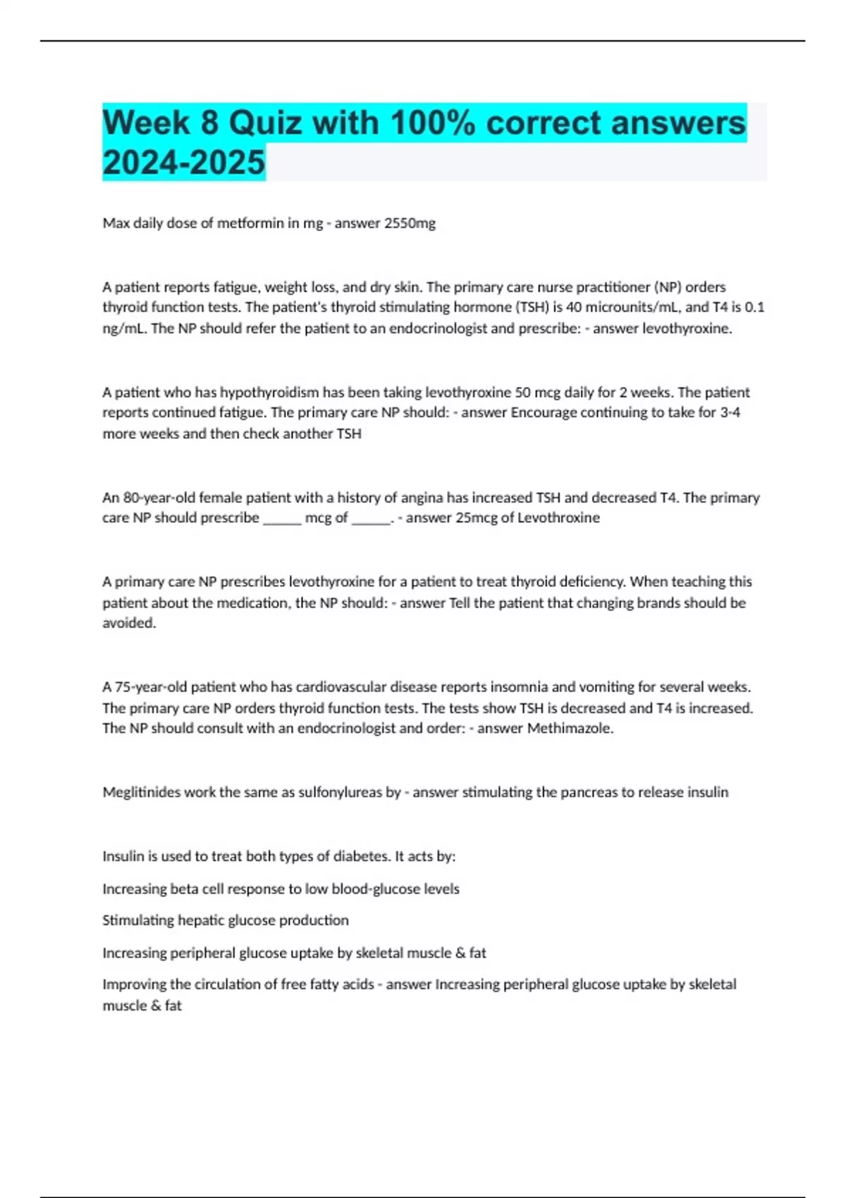 Max daily dose of metformin in mg 2550mg A patient reports fatigue, weight loss, and dry skin. The primary care nurse practitioner (NP) orders thyroid function tests. The patient's thyroid stimulating hormone (TSH) is 40 microunits/mL, and T4 is 0.1 ng/mL. The NP should refer the patient to an endocrinologist and prescribe: levothyroxine. Brainpower Read More Previous Play Next Rewind 10 seconds Move forward 10 seconds Unmute 0:00 / 0:15 Full screen A patient who has hypothyroidism has been taking levothyroxine 50 mcg daily for 2 weeks. The patient reports continued fatigue. The primary care NP should: Encourage continuing to take for 3-4 more weeks and then check another TSH An 80-year-old female patient with a history of angina has increased TSH and decreased T4. The primary care NP should prescribe _____ mcg of _____. 25mcg of Levothroxine A primary care NP prescribes levothyroxine for a patient to treat thyroid deficiency. When teaching this patient about the medication, the NP should: Tell the patient that changing brands should be avoided. A 75-year-old patient who has cardiovascular disease reports insomnia and vomiting for several weeks. The primary care NP orders thyroid function tests. The tests show TSH is decreased and T4 is increased. The NP should consult with an endocrinologist and order: Methimazole. Meglitinides work the same as sulfonylureas by stimulating the pancreas to release insulin Insulin is used to treat both types of diabetes. It acts by: Increasing beta cell response to low blood-glucose levels Stimulating hepatic glucose production Increasing peripheral glucose uptake by skeletal muscle & fat Improving the circulation of free fatty acids Increasing peripheral glucose uptake by skeletal muscle & fat Insulin preparations are divided into categories based on onset, duration, & intensity of action following subcutaneous injection. Which of the following insulin preparations has the shortest onset & duration of action? Lispro Glulisine (Humalog) Glargine Detemir Glulisine (Humalog) The drug of choice for type 2 diabetics is metformin. Metformin: Decreases glycogenolysis by the liver Increases the release of insulin from beta cells Increases intestinal uptake of glucose Prevents weight gain associated with hyperglycemia Decreases glycogenolysis by the liver What problem should the nurse assess for in a patient with chronic hyperparathyroidism? Osterporosis and pathologic fractures hyponatremia vitamin k malabsorption seziures Osterporosis and pathologic fractures What classification of OAD (Oral Anti-diabetic) medication delays the absorption of carbohydrates from the GI TRACT? Biguanidesb. Thiazolidinediones. Alpha- Glucosidase. Meglitinidese. Sulfonylureas Alpha- Glucosidase. What Oral Antidiabetic stimulates beta cells to secrete more insulin and increase receptor sites in the tissue? Alfa-Glucosidase Inhibitors Biguanides Sulfonylureas Thiazolidinediones Meglitnides Sulfonylureas The nurse practitioner finds a solitary nodule on the clients' thyroid gland during a routine physical exam. How should the NP proceed with a management of this case? Referral to a general surgeon Thyroid hormone levels and sonogram X-ray examination of the thyroid Immediate referral to an endocrinologist Thyroid hormone levels and sonogram surgery and metformin With held a few days before the surgery A client with Graves's disease is to have radioactive iodine therapy. When teaching about this treatment, what information should the NP include? Clients are highly radioactive for approximately 7 days after treatment and need to be isolated Clients should not become pregnant during or receiving treatment because of the potential teratogenic effects. Clients may experience hypothyroidism after this treatment and will need regular TSH and T4 levels determined and may require thyroid hormone replacement therapy. This therapy in contraindicated in clients with cardiac disease. Clients may experience hypothyroidism after this treatment and will need regular TSH and T4 levels determined and may require thyroid hormone replacement therapy.