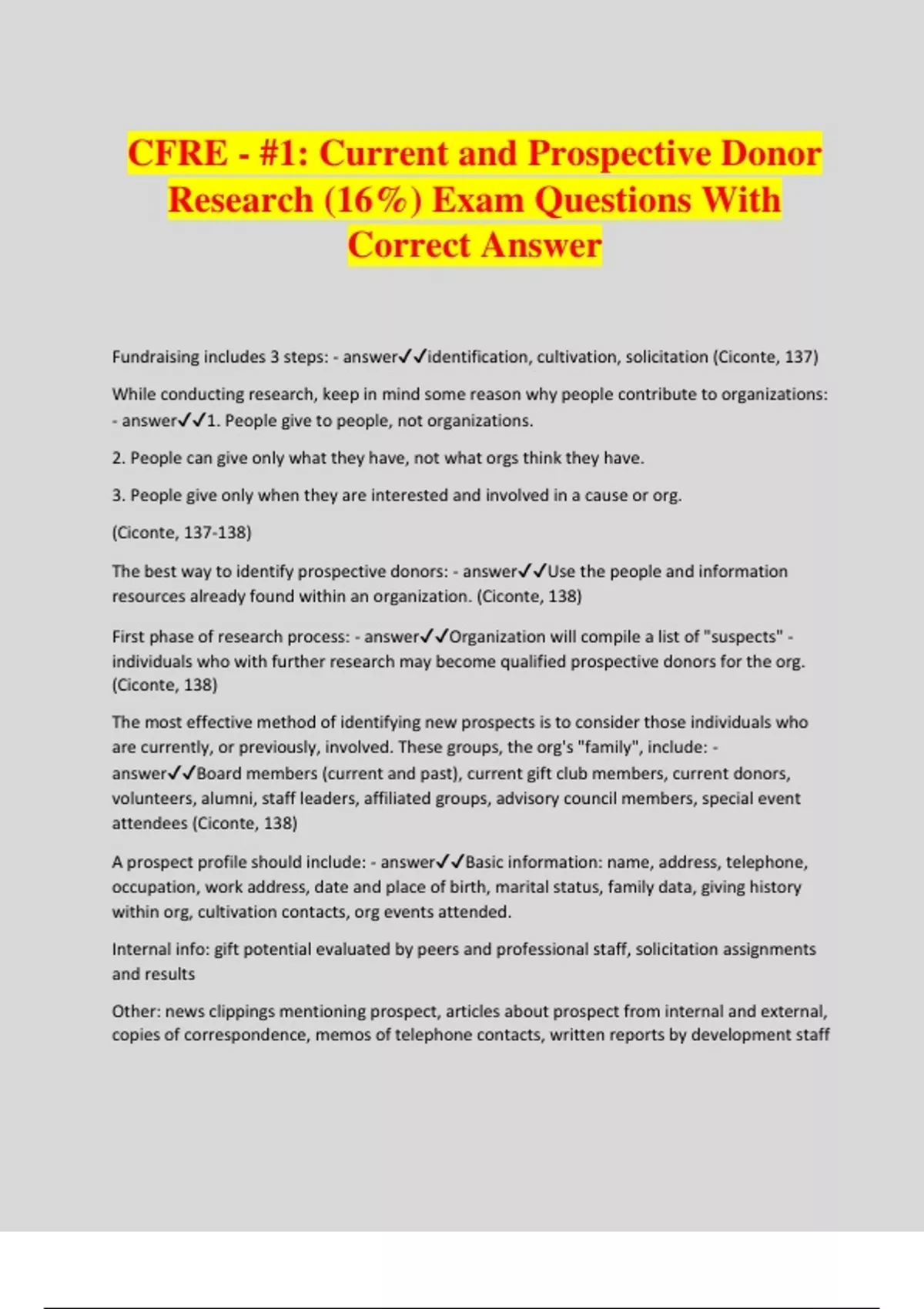 CFRE - #1: Current and Prospective Donor Research (16%) Exam Questions With Correct Answer Fundraising includes 3 steps: - answeridentification, cultivation, solicitation (Ciconte, 137) While conducting research, keep in mind some reason why people contribute to organizations: - answer1. People give to people, not organizations. 2. People can give only what they have, not what orgs think they have. 3. People give only when they are interested and involved in a cause or org. (Ciconte, 137-138) The best way to identify prospective donors: - answerUse the people and information resources already found within an organization. (Ciconte, 138) First phase of research process: - answerOrganization will compile a list of "suspects" - individuals who with further research may become qualified prospective donors for the org. (Ciconte, 138) The most effective method of identifying new prospects is to consider those individuals who are currently, or previously, involved. These groups, the org's "family", include: - answerBoard members (current and past), current gift club members, current donors, volunteers, alumni, staff leaders, affiliated groups, advisory council members, special event attendees (Ciconte, 138) A prospect profile should include: - answerBasic information: name, address, telephone, occupation, work address, date and place of birth, marital status, family data, giving history within org, cultivation contacts, org events attended. Internal info: gift potential evaluated by peers and professional staff, solicitation assignments and results Other: news clippings mentioning prospect, articles about prospect from internal and external, copies of correspondence, memos of telephone contacts, written reports by development staff More comprehensive info for selected prospects: income and assets, insider stock ownership, directorships, family and community foundation connections, social, political, community associations, club memberships. (Ciconte, 138-139) Outside org tools for research: - answerInternet service; online subscription fees for newspapers, magazines, journals; onlin