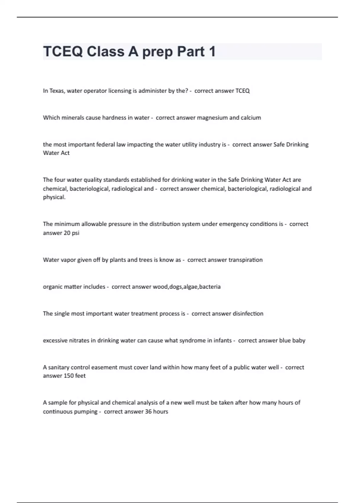 TCEQ Class A prep Part 1In Texas, water operator licensing is administer by the? - correct answer TCEQ Which minerals cause hardness in water - correct answer magnesium and calcium the most important federal law impacting the water utility industry is - correct answer Safe Drinking Water Act The four water quality standards established for drinking water in the Safe Drinking Water Act are chemical, bacteriological, radiological and - correct answer chemical, bacteriological, radiological and physical. The minimum allowable pressure in the distribution system under emergency conditions is - correct answer 20 psi Water vapor given off by plants and trees is know as - correct answer transpiration organic matter includes - correct answer wood,dogs,algae,bacteria The single most important water treatment process is - correct answer disinfection excessive nitrates in drinking water can cause what syndrome in infants - correct answer blue baby A sanitary control easement must cover land within how many feet of a public water well - correct answer 150 feet A sample for physical and chemical analysis of a new well must be taken after how many hours of continuous pumping - correct answer 36 hours