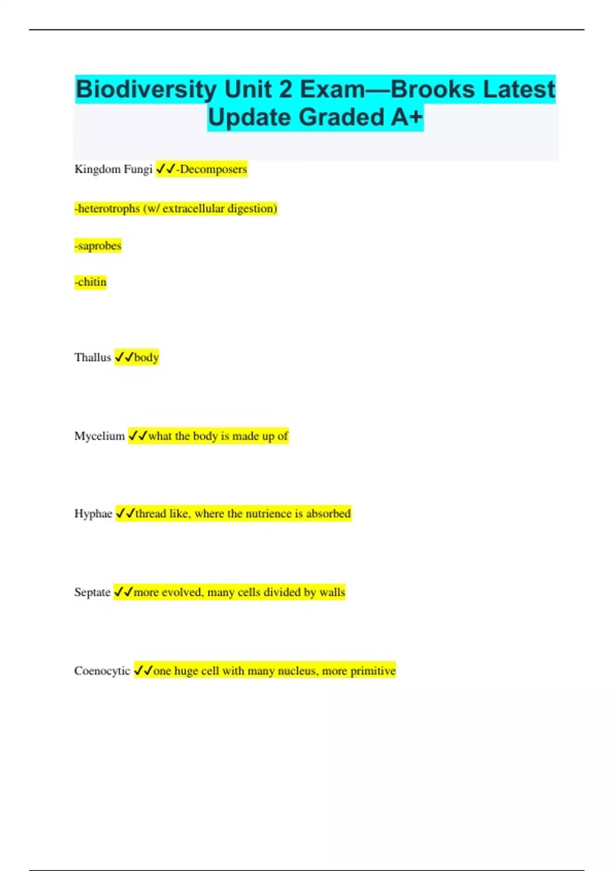Biodiversity Unit 2 Exam—Brooks Latest Update Graded A+ Kingdom Fungi -Decomposers -heterotrophs (w/ extracellular digestion) -saprobes -chitin Thallus body Mycelium what the body is made up of Hyphae thread like, where the nutrience is absorbed Septate more evolved, many cells divided by walls Coenocytic one huge cell with many nucleus, more primitive Haustoria branching projections that push through cell walls into the living plant cells, absorbing nutrient Heterokaryon e.g. Dikaryon Dikaryon temporary stage during sexual reproduction before the fusion of nuclei Karyogamy fusion of nuclei N= Ploidy how man chromosomes present haploid (n) 1 set diploid (2n) dikaryotic (n+n) spore dispersion easily spread in the wind or water, ensuring that they will be scattered over distances, & that at least some of them will find conditions suitable for growth fungal survival when fungus faces dwindling supply, they reproduce spores rapidly and abundantly, the spores remain dormant until the conditions improve or disperse to other areas where nutrient supplies