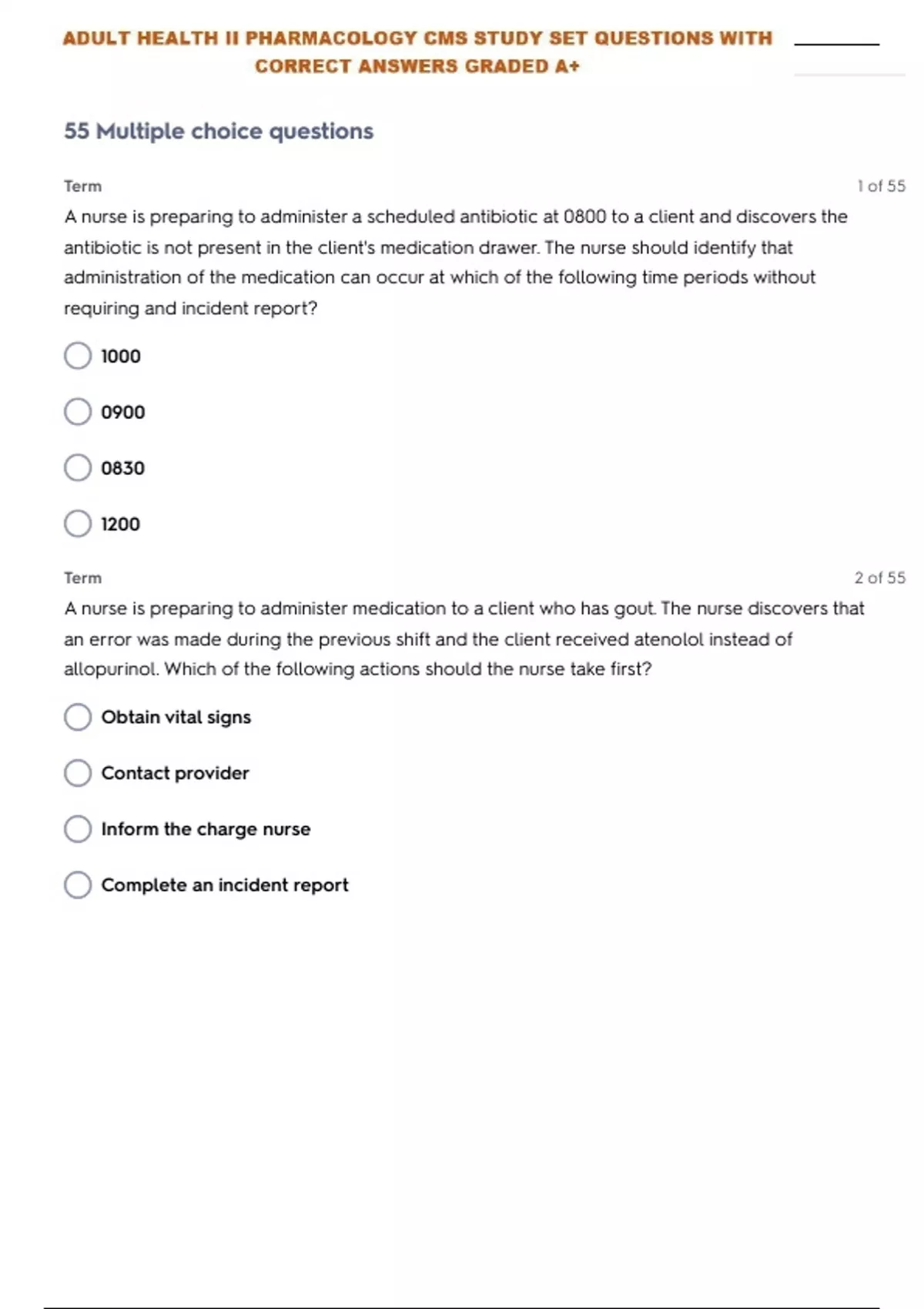 ADULT HEALTH II PHARMACOLOGY CMS STUDY SET QUESTIONS WITH CORRECT ANSWERS GRADED A+